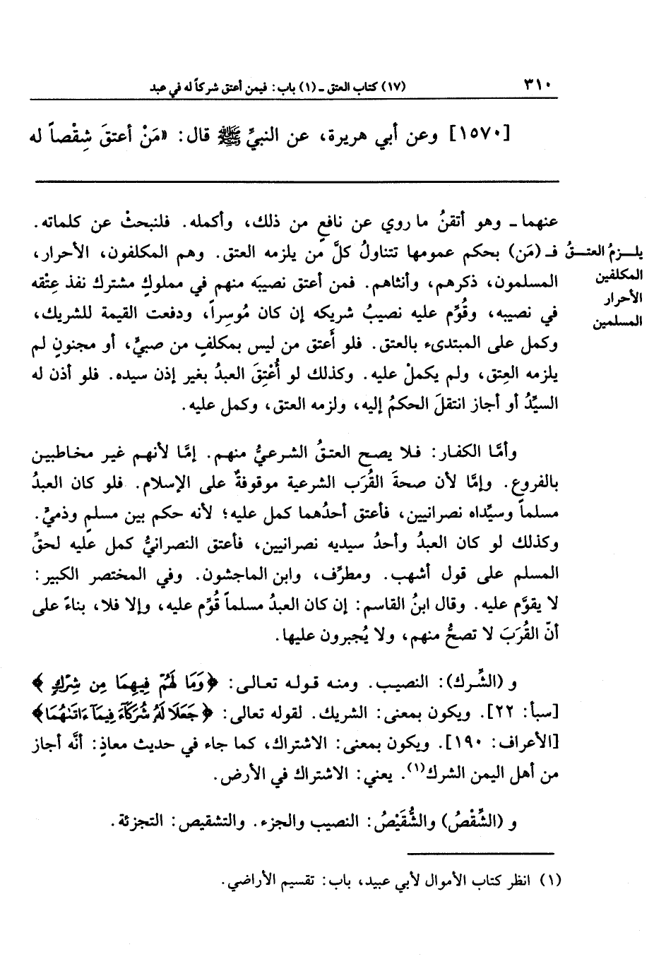 [1570] وعَن أبي هريرة: عَن النَّبِيِّ صَلَّى اللَّهُ عَلَيهِ وَسَلَّمَ قَالَ: مَن أَعتَقَ شِقصًا لَهُ