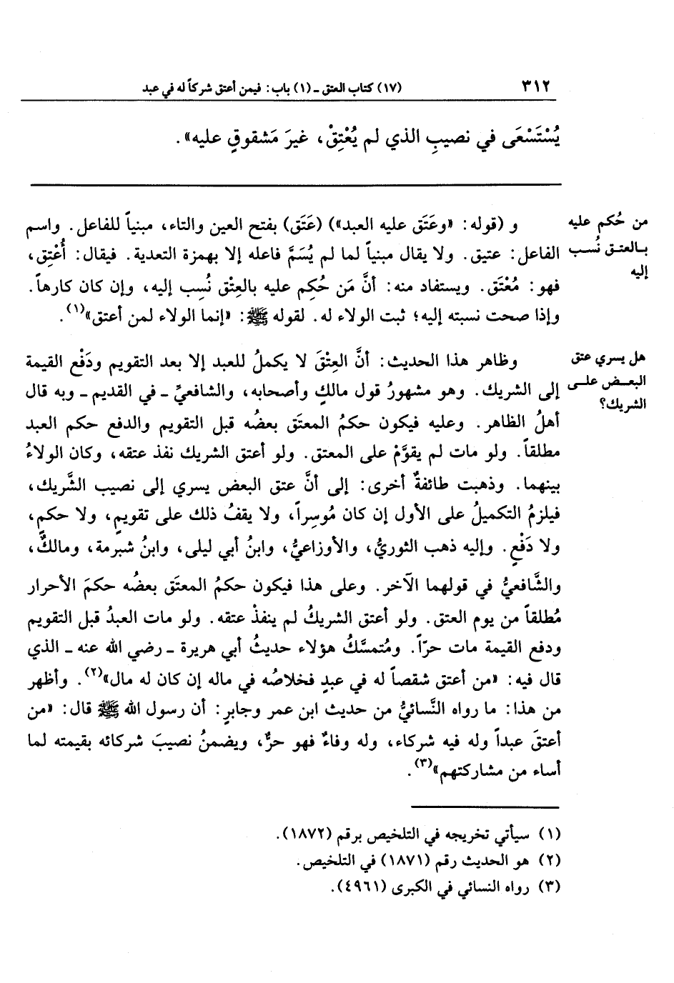 وعلى هذا فيكون حكم المعتق بعضه حكم الأحرار مطلقا من يوم العتق. ولو أعتق الشريك لم ينفذ عتقه. ولو مات العبد قبل التقويم ودفع القيمة مات حرًّا. ومتمسَّك هؤلاء حديث أبي هريرة ـ رضي الله عنه ـ الذي قال فيه: (من أعتق شقصًا له في عبد فخلاصُه في ماله إن كان له مال) (¬2). وأظهر من هذا: ما رواه النسائي من حديث ابن عمر وجابر: أن رسول الله صلى الله عليه وسلم قال: (من أعتق عبدًا وله فيه شركاء، وله وفاء فهو حُرٌّ، ويضمن نصيب شركائه بقيمته لما أساء من مشاركتهم) (¬3).