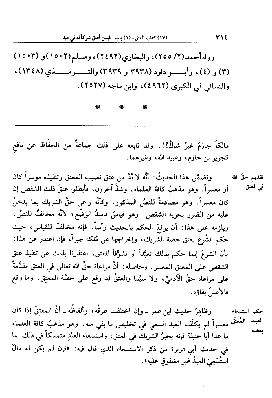 وتضمَّن هذا الحديث: أنَّه لا بدَّ من عتق نصيب المعتق وتنفيذه موسرًا كان أو معسرًا. وهو مذهب كافة العلماء. وشذَّ آخرون، فأبطلوا عتق ذلك الشقص إن كان معسرًا. وهو مصادمة للنص المذكور. وكأنَّه راعى حق الشريك بما يدخل عليه من الضرر بحرية الشقص. وهو قياس فاسد الوضع؛ لأنه مخالف للنص. ويلزمه على هذا: أن يرفع الحكم بالحديث رأسًا، فإنه مخالف للقياس، حيث حكم الشرع بعتق حصة الشريك، وإخراجها عن ملكه جبرًا، فإن اعتذر عن هذا: بأن الشرع إنما حكم بذلك تعبدًا، أو تشوفًا للعتق، اعتذرنا بذلك عن تنفيذ عتق الشقص على المعتق المعسر.