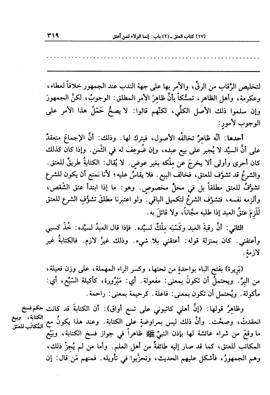 لتخليص الرقاب من الرِّق، والأمر بها على جهة الندب عند الجمهور خلافًا لعطاء، وعكرمة، وأهل الظاهر، تمسُّكا بأن ظاهر الأمر المطلق: الوجوب، لكن الجمهور وإن سلموا ذلك الأصل الكلِّي، لكنهم قالوا: لا يصحُّ حمل هذا الأمر على الوجوب لأمور: