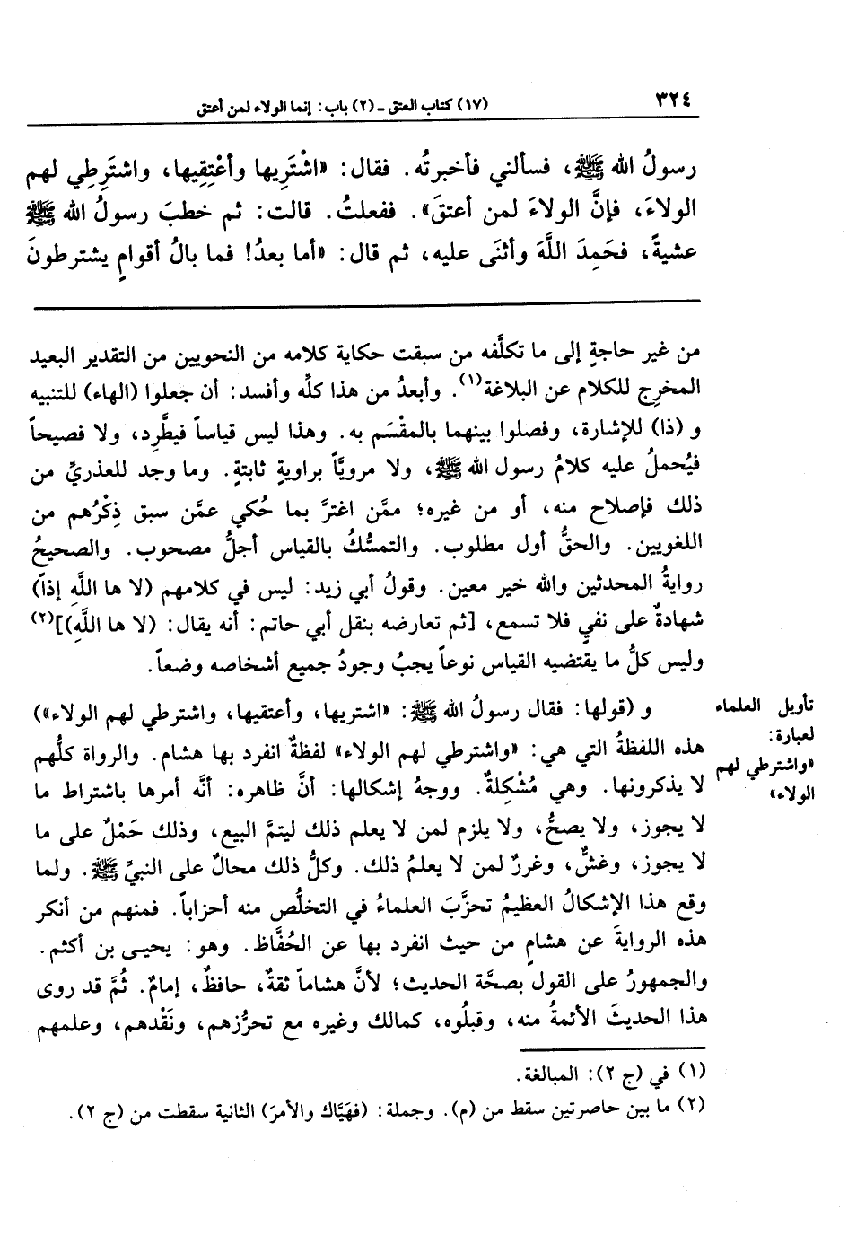 و(قولها: فقال رسول الله صلى الله عليه وسلم: (اشتريها، وأعتقيها، واشترطي لهم الولاء) هذه اللفظة التي هي: (واشترطي لهم الولاء) لفظة انفرد بها هشام. والرواة كلهم لا يذكرونها. وهي مشكلة. ووجه إشكالها: أن ظاهره: أنه أمرها باشتراط ما لا يجوز، ولا يصحّ، ولا يلزم لمن لا يعلم ذلك ليتم البيع، وذلك حَمل على ما لا يجوز، وغشٌّ، وغرر لمن لا يعلم ذلك. وكل ذلك محال على النبي صلى الله عليه وسلم. ولَمَّا وقع هذا الإشكال العظيم تحزَّب العلماء في التخلص منه أحزابًا. فمنهم من أنكر هذه الرواية عن هشام من حيث انفرد بها عن الحفاظ. وهو: يحيى بن أكثم. والجمهور على القول بصحَّة الحديث؛ لأن هشامًا ثقة، حافظ، إمام. ثم قد روى هذا الحديث الأئمة منه، وقبلوه، كمالك وغيره مع تَحَّرزهم، ونقدهم، وعلمهم