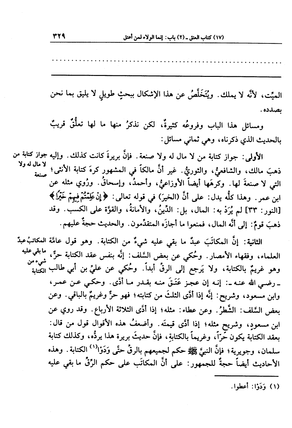 وهذا كلُّه يدل على أن (الخير) في قوله تعالى: {إِن عَلِمتُم فِيهِم خَيرًا} لم يرد به المال، بل: الدين، والأمانة، والقوة على الكسب. وقد ذهب قوم إلى أنه المال، فمنعوا ما أجازه المتقدمون، والحديث حجة عليهم.