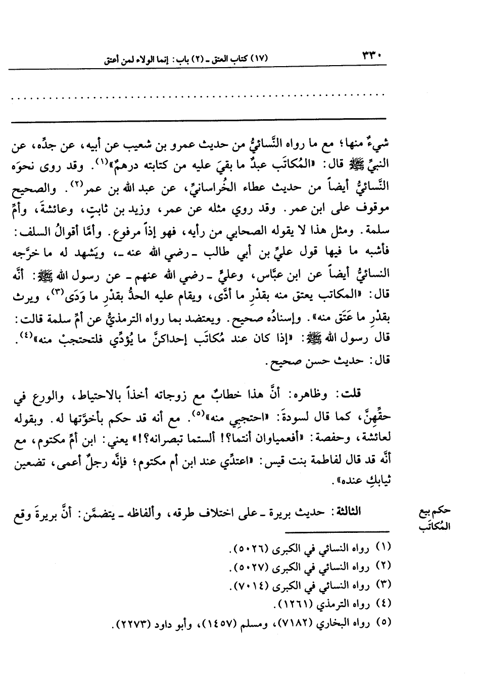 وأما أقوال السلف؛ فأشبه ما فيها قول علي بن أبي طالب ـ رضي الله عنه ـ ويشهد له ما خرَّجه النسائي أيضًا عن ابن عباس، وعلي رضي الله عنهم، عن رسول الله صلى الله عليه وسلم؛ أنه قال: (المكاتب يعتق منه بقدر ما أدَّى، ويقام عليه الحد بقدر ما وَدَى (¬3)، ويرث بقدر ما عتق منه). وإسناده صحيح. ويعتضد بما رواه الترمذي عن أم سلمة قالت: قال رسول الله صلى الله عليه وسلم: (إذا كان عند مكاتب إحداكن ما يؤدِّي فلتحتجب منه) (¬4). قال: حديث حسن صحيح.