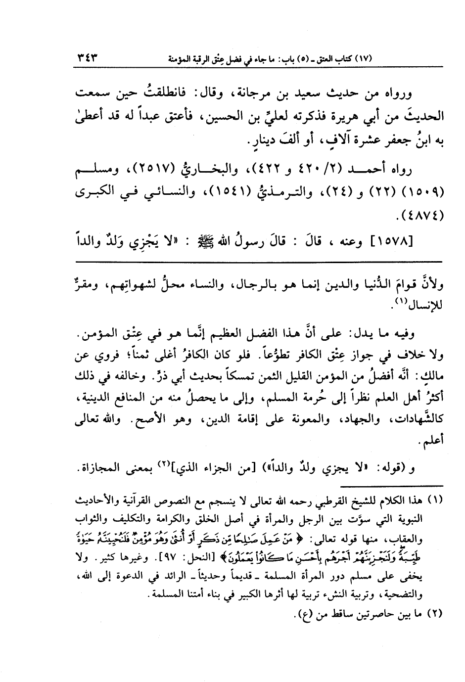 (¬1) هذا الكلام للشيخ القرطبي رحمه الله تعالى لا ينسجم مع النصوص القرآنية والأحاديث النبوية التي سوَّت بين الرجل والمرأة في أصل الخلق والكرامة والتكليف والثواب والعقاب، منها قوله تعالى: {مَنْ عَمِلَ صَالِحًا مِنْ ذَكَرٍ أَوْ أُنْثَى وَهُوَ مُؤْمِنٌ فَلَنُحْيِيَنَّهُ حَيَاةً طَيِّبَةً وَلَنَجْزِيَنَّهُمْ أَجْرَهُمْ بِأَحْسَنِ مَا كَانُوا يَعْمَلُونَ} [النحل: 97]. وغيرها كثير. ولا يخفى على مسلم دور المرأة المسلمة -قديمًا وحديثًا- الرائد في الدعوة إلى الله، والتضحية، وتربية النشء تربية لها أثرها الكبير في بناء أمتنا المسلمة.