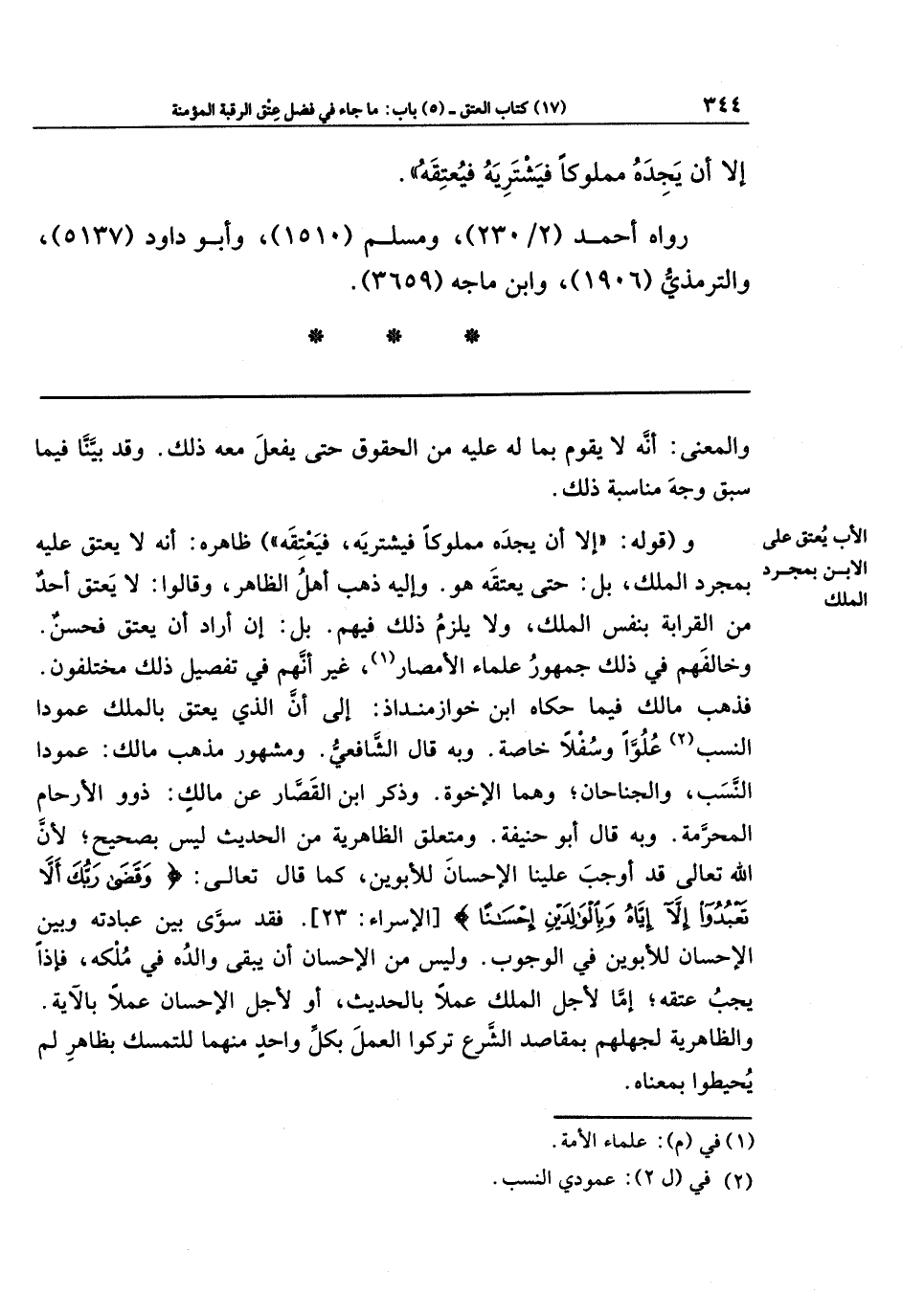 ومشهور مذهب مالك: عمودا النسب، والجناحان: وهما الإخوة. وذكر ابن القصَّار عن مالك: ذوو الأرحام المحرمة. وبه قال أبو حنيفة. ومتعلق الظاهرية من الحديث ليس بصحيح؛ لأن الله تعالى قد أوجب علينا الإحسان للأبوين، كما قال تعالى: {وَقَضَى رَبُّكَ أَلا تَعبُدُوا إِلا إِيَّاهُ وَبِالوَالِدَينِ إِحسَانًا} فقد سوَّى بين عبادته وبين الإحسان للأبوين في الوجوب. وليس من الإحسان أن يبقى والده في ملكه، فإذا يجب عتقه، إما لأجل الملك عملًا بالحديث، أو لأجل الإحسان عملًا بالآية. والظاهرية لجهلهم بمقاصد الشرع تركوا العمل بكل واحد منهما للتمسك بظاهر لم يحيطوا بمعناه.