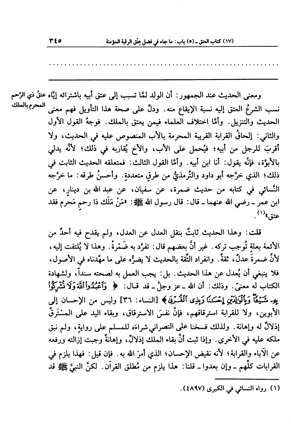 قلت: وهذا الحديث ثابت بنقل العدل عن العدل، ولم يقدح فيه أحد من الأئمة بعلة توجب تركه. غير أن بعضهم قال: تفرد به ضمرة. وهذا لا يلتفت إليه، لأن ضمرة عدل، ثقة. وانفراد الثقة بالحديث لا يضره على ما مهَّدناه في الأصول، فلا ينبغي أن يعدل عن هذا الحديث. بل: يجب العمل به لصحته سندًا، ولشهادة الكتاب له معنى. وذلك: أن الله عز وجل قد قال: {وَاعبُدُوا اللَّهَ وَلا تُشرِكُوا بِهِ شَيئًا وَبِالوَالِدَينِ إِحسَانًا وَبِذِي القُربَى} وليس من الإحسان إلى الأبوين، ولا للقرابة استرقاقهم، فإن نفس الاسترقاق، وبقاء اليد على المسترق إذلال له وإهانة. ولذلك فسخنا على النصراني شراءه للمسلم على رواية، ولم نبق ملكه عليه في الأخرى. وإذا ثبت أن بقاء الملك إذلال، وإهانة؛ وجبت إزالته ورفعه عن الآباء والقرابة؛ لأنه نقيض الإحسان؛ الذي أمر الله به.