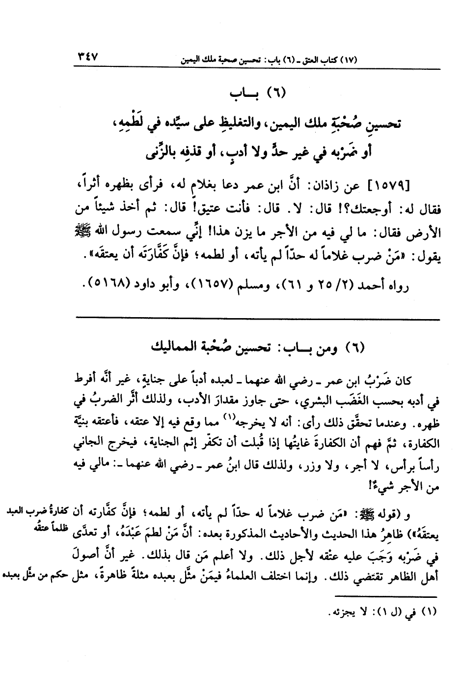 [1579] عَن زَاذَانَ: أَنَّ ابنَ عُمَرَ دَعَا بِغُلَامٍ لَهُ، فَرَأَى بِظَهرِهِ أَثَرًا فَقَالَ لَهُ: أَوجَعتُكَ؟ قَالَ: لَا، قَالَ: فَأَنتَ عَتِيقٌ. قَالَ: ثُمَّ أَخَذَ شَيئًا مِن الأَرضِ فَقَالَ: مَا لِي فِيهِ مِن الأَجرِ مَا يَزِنُ هَذَا، إِنِّي سَمِعتُ رَسُولَ اللَّهِ صَلَّى اللَّهُ عَلَيهِ وَسَلَّمَ يَقُولُ: مَن ضَرَبَ غُلَامًا لَهُ حَدًّا لَم يَأتِهِ أَو لَطَمَهُ، فَإِنَّ كَفَّارَتَهُ أَن يُعتِقَهُ.