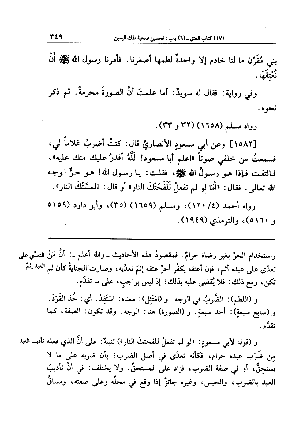 [1582] وعَن أَبِي مَسعُودٍ الأَنصَارِيِّ قَالَ: كُنتُ أَضرِبُ غُلَامًا لِي، فَسَمِعتُ مِن خَلفِي صَوتًا: اعلَم أَبَا مَسعُودٍ، لَلَّهُ أَقدَرُ عَلَيكَ مِنكَ عَلَيهِ. فَالتَفَتُّ فَإِذَا هُوَ رَسُولُ اللَّهِ صَلَّى اللهُ عَلَيهِ وَسَلَّمَ، فَقُلتُ: يَا رَسُولَ اللَّهِ، هُوَ حُرٌّ لِوَجهِ اللَّهِ تعالى، فَقَالَ: أَمَا لَو لَم تَفعَل، لَلَفَحَتكَ النَّارُ، أَو قال: لَمَسَّتكَ النَّارُ.