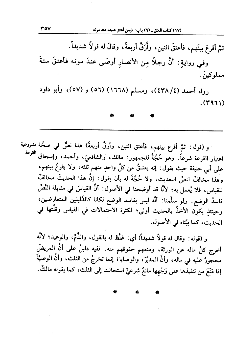 وفي رواية: أَنَّ رَجُلًا مِن الأَنصَارِ أَوصَى عِندَ مَوتِهِ، فَأَعتَقَ سِتَّةَ مَملُوكِينَ.