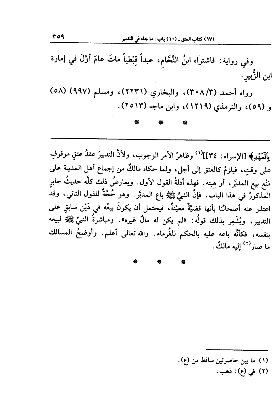 بِالعَهدِ} (¬1) وظاهر الأمر الوجوب، ولأن التدبير عقد عتق موقوف على وقت، فيلزم كالعتق إلى أجل، ولما حكاه مالك من إجماع أهل المدينة على منع بيع المدبَّر، أو هبته. فهذه أدلة القول الأول. ويعارض ذلك كله حديث جابر المذكور في هذا الباب. فإن النبي صلى الله عليه وسلم باع المدبَّر. وهو حجة القول الثاني، وقد اعتذر عنه أصحابنا بأنها قضية معينة، فيحتمل أن يكون بيعه في دين سابق على التدبير، ويشعر بذلك قوله: (لم يكن له مال غيره). ومباشرة النبي صلى الله عليه وسلم لبيعه بنفسه، فكأنه باعه عليه بالحكم للغُرماء، والله تعالى أعلم.