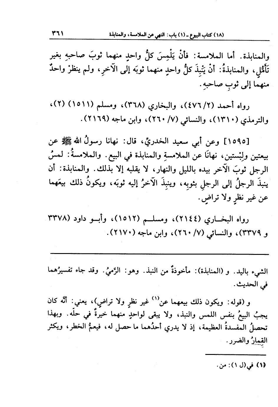 وَالمُنَابَذَةِ، أَمَّا المُلَامَسَةُ: فَأَن يَلمِسَ كُلُّ وَاحِدٍ مِنهُمَا ثَوبَ صَاحِبِهِ بِغَيرِ تَأَمُّلٍ، وَالمُنَابَذَةُ: أَن يَنبِذَ كُلُّ وَاحِدٍ مِنهُمَا ثَوبَهُ إِلَى الآخَرِ، وَلَم يَنظُر وَاحِدٌ مِنهُمَا إِلَى ثَوبِ صَاحِبِهِ.