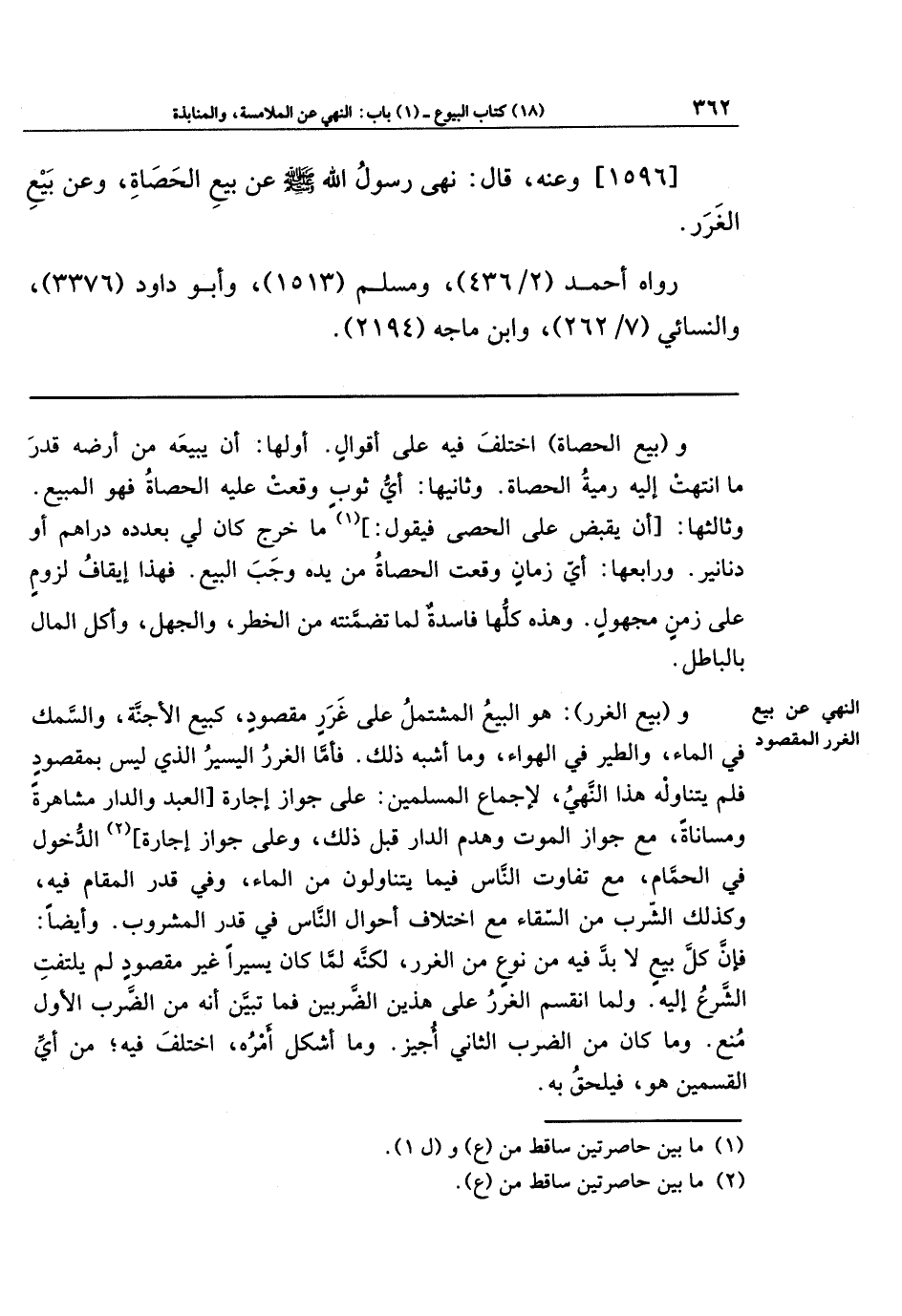[1596] وعنه قَالَ: نَهَى رَسُولُ اللَّهِ صَلَّى اللَّهُ عَلَيهِ وَسَلَّمَ عَن بَيعِ الحَصَاةِ، وَعَن بَيعِ الغَرَرِ.
