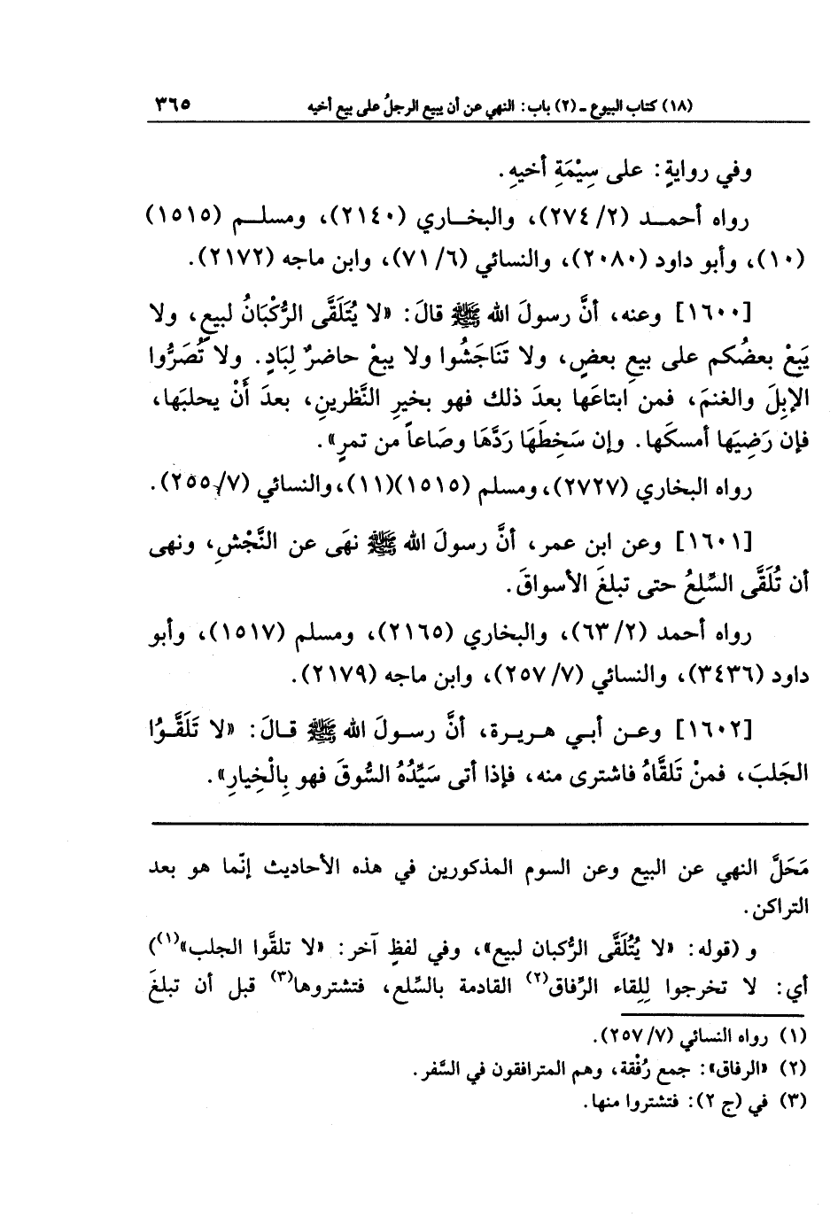 [1600] وعنه أَنَّ رَسُولَ اللَّهِ صَلَّى اللَّهُ عَلَيهِ وَسَلَّمَ قَالَ: لَا يُتَلَقَّى الرُّكبَانُ لِبَيعٍ، وَلَا يَبِع بَعضُكُم عَلَى بَيعِ بَعضٍ، وَلَا تَنَاجَشُوا، وَلَا يَبِع حَاضِرٌ لِبَادٍ، وَلَا تُصَرُّوا الإِبِلَ وَالغَنَمَ، فَمَن ابتَاعَهَا بَعدَ ذَلِكَ فَهُوَ بِخَيرِ النَّظَرَينِ، بَعدَ أَن يَحلُبَهَا، فَإِن رَضِيَهَا أَمسَكَهَا، وَإِن سَخِطَهَا رَدَّهَا، وَصَاعًا مِن تَمرٍ.