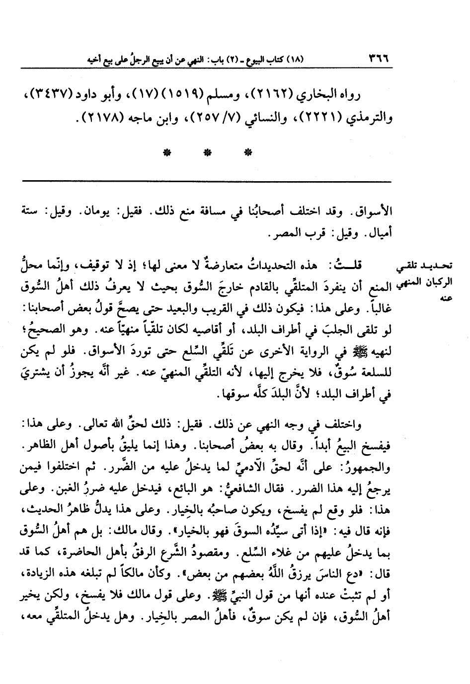قلت: هذه التحديدات متعارضة لا معنى لها؛ إذ لا توقيف، وإنما محل المنع أن ينفرد المتلقِّي بالقادم خارج السُّوق بحيث لا يعرفُ ذلك أهل السُّوق غالبًا. وعلى هذا فيكون ذلك في القريب والبعيد حتى يصحَّ قول بعض أصحابنا: لو تلقى الجلب في أطراف البلد، أو أقاصيه لكان تلقيًا منهيًا عنه، وهو الصحيح؛ لنهيه صلى الله عليه وسلم في الرواية الأخرى عن تلقي السِّلع حتى تورد الأسواق. فلو لم يكن للسلعة سوق، فلا يخرج إليها، لأنه التلقي المنهي عنه. غير أنه يجوز أن يشتري في أطراف البلد؛ لأن البلد كله سوقها.