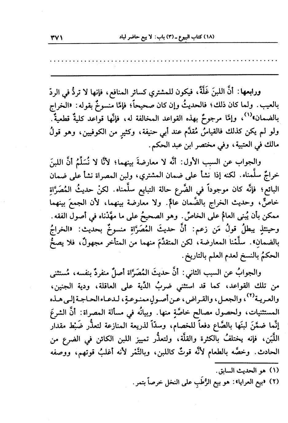 والجواب عن السبب الأول: أنه لا معارضة بينهما؛ لأنا لا نسلم أن اللبن خراج سَلَّمناه. لكنه إذا نشأ على ضمان المشتري، ولبن المصراة نشأ على ضمان البائع؛ فإنَّه كان موجودًا في الضرع حالة التبايع سلّمناه. لكن حديث المصرَّاة خاصٌّ، وحديث الخراج بالضمان عام. ولا معارضة بينهما، لأن الجمع بينهما ممكن بأن يُبنى العام على الخاص. وهو الصحيح على ما مهدناه في أصول الفقه. وحينئذ يبطل قول من زعم: أن حديث المصراة منسوخ بحديث: (الخراج بالضمان). سلمنا المعارضة، لكن المتقدم منهما من المتأخر مجهول، فلا يصح الحكم بالنسخ لعدم العلم بالتاريخ.