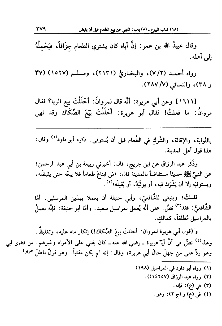 [1611] وعَن أَبِي هُرَيرَةَ أَنَّهُ قَالَ لِمَروَانَ: أَحلَلتَ بَيعَ الرِّبَا؟ فَقَالَ مَروَانُ: مَا فَعَلتُ. فَقَالَ أَبُو هُرَيرَةَ: أَحلَلتَ بَيعَ الصِّكَاكِ، وَقَد نَهَى