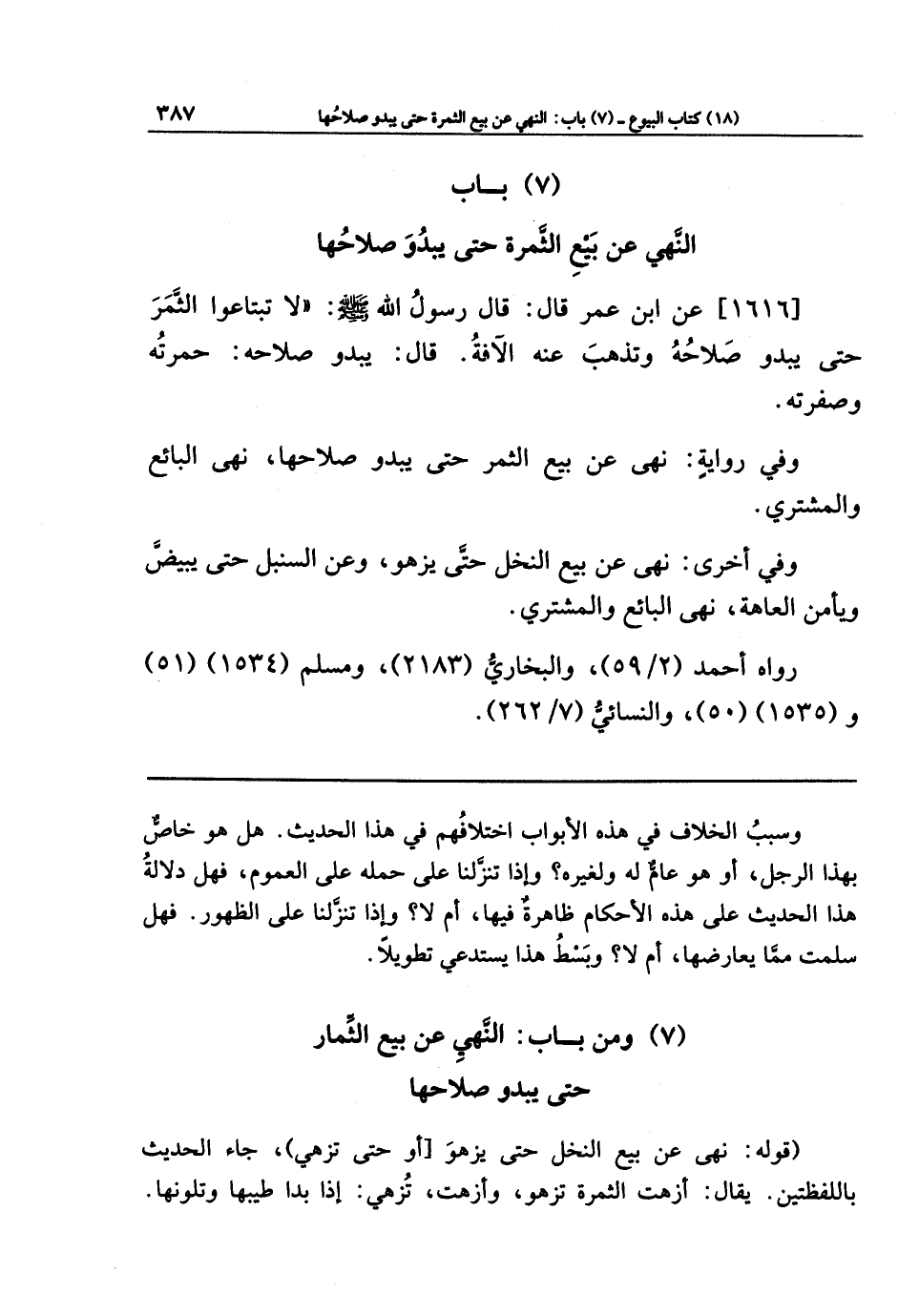 [1616] عَن ابنِ عُمَرَ، قَالَ: قَالَ رَسُولُ اللَّهِ صَلَّى اللهُ عَلَيهِ وَسَلَّمَ: لَا تَبتَاعُوا الثَّمَرَ حَتَّى يَبدُوَ صَلَاحُهُ وَتَذهَبَ عَنهُ الآفَةُ. قَالَ: يَبدُوَ صَلَاحُهُ: حُمرَتُهُ وَصُفرَتُهُ.
