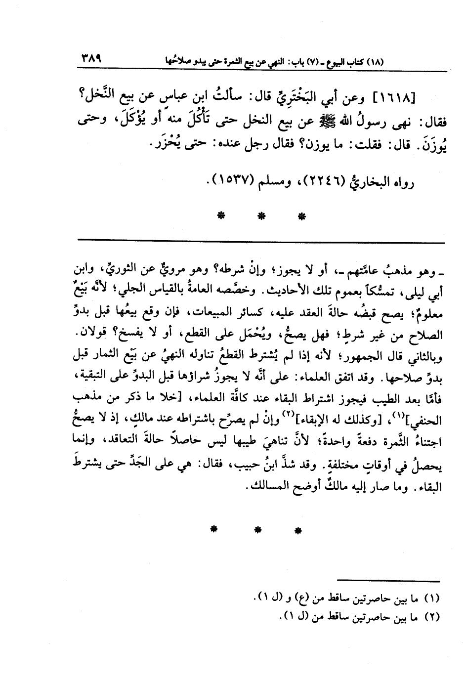 [1618] وعَن أَبِي البَختَرِيِّ قَالَ: سَأَلتُ ابنَ عَبَّاسٍ عَن بَيعِ النَّخلِ فَقَالَ: نَهَى رَسُولُ اللَّهِ صَلَّى اللَّهُ عَلَيهِ وَسَلَّمَ عَن بَيعِ النَّخلِ حَتَّى تَأكُلَ مِنهُ، أَو يُؤكَلَ، وَحَتَّى يُوزَنَ. قَالَ: فَقُلتُ: مَا يُوزَنُ؟ فَقَالَ رَجُلٌ عِندَهُ: حَتَّى يُحزَرَ.