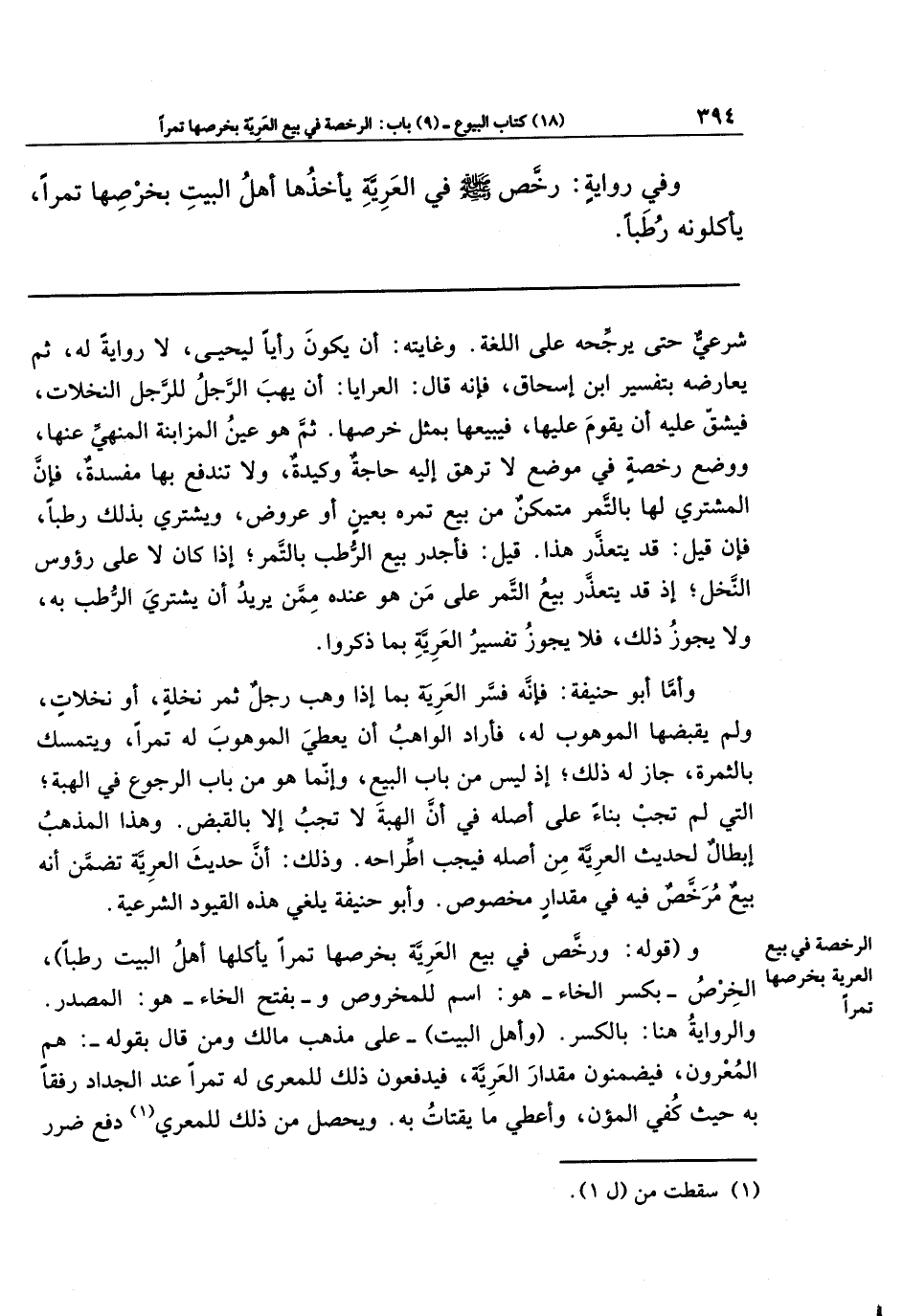 وأمَّا أبو حنيفة: فإنَّه فسَّر العرية بما إذا وهب رجل ثمر نخلة، أو نخلات، ولم يقبضها الموهوب له، فأراد الواهب أن يعطي الموهوب له تمرا، ويتمسك بالثمرة، جاز له ذلك؛ إذ ليس من باب البيع، وإنما هو من باب الرجوع في الهبة؛ التي لم تجب بناء على أصله في أن الهبة لا تجب إلا بالقبض. وهذا المذهب إبطال لحديث العرية من أصله فيجب اطراحه. وذلك: أن حديث العرية تضمن أنه بيع مُرَخَّص فيه في مقدار مخصوص. وأبو حنيفة يلغي هذه القيود الشرعية.