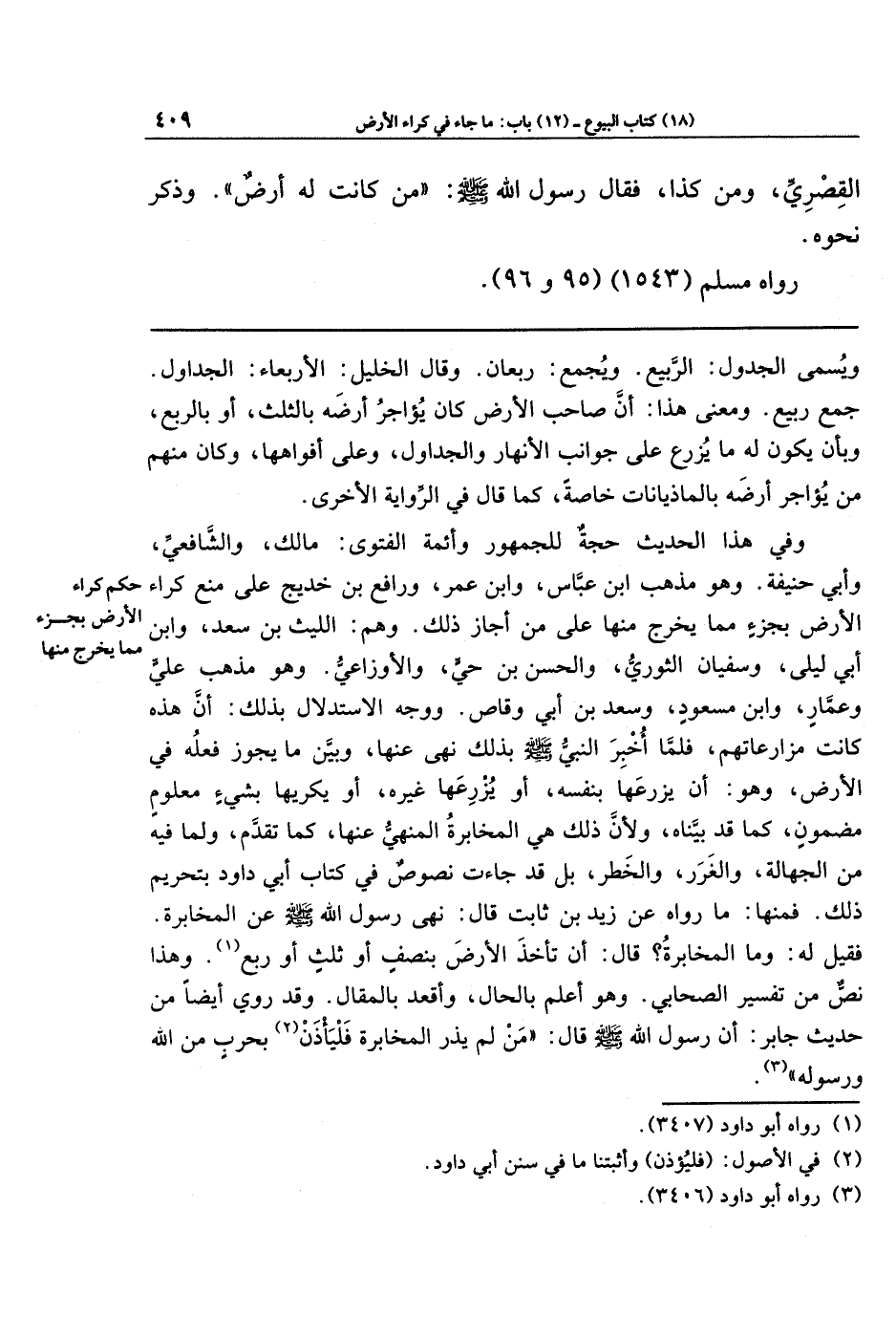 ومعنى هذا: أن صاحب الأرض كان يؤاجر أرضه بالثلث، أو بالربع، وبأن يكون له ما يزرع على جوانب الأنهار والجداول، وعلى أفواهها، وكان منهم من يؤاجر أرضه بالماذيانات خاصة، كما قال في الرواية الأخرى.