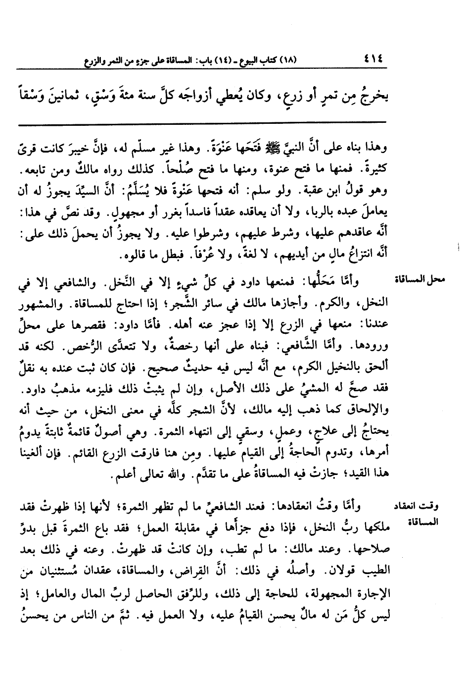 وأما محلها: فمنعها داود في كل شيء إلا في النخل. والشافعي إلا في النخل، والكرم. وأجازها مالك في سائر الشجر؛ إذا احتاج للمساقاة. والمشهور عندنا: منعها في الزرع إلا إذا عجز عنه أهله. فأمَّا داود: فقصرها على محل ورودها، وأما الشافعي: فبناه على أنها رخصة، ولا تتعدى الرخص. لكنه قد ألحق بالنخيل الكرم، مع أنه ليس فيه حديث صحيح. فإن كان ثبت عنده به نقل فقد صح له المشي على ذلك الأصل، وإن لم يثبت ذلك فليزمه مذهب داود. والإلحاق كما ذهب إليه مالك، لأن الشجر كله في معنى النخل، من حيث إنه يحتاج إلى علاج، وعمل، وسقي إلى انتهاء الثمرة. وهي أصول قائمة ثابتة يدوم أمرها، وتدوم الحاجة إلى القيام عليها. ومن هنا فارقت الزرع القائم. فإن ألغينا هذا القيد؛ جازت فيه المساقاة على ما تقدَّم. والله تعالى أعلم.
