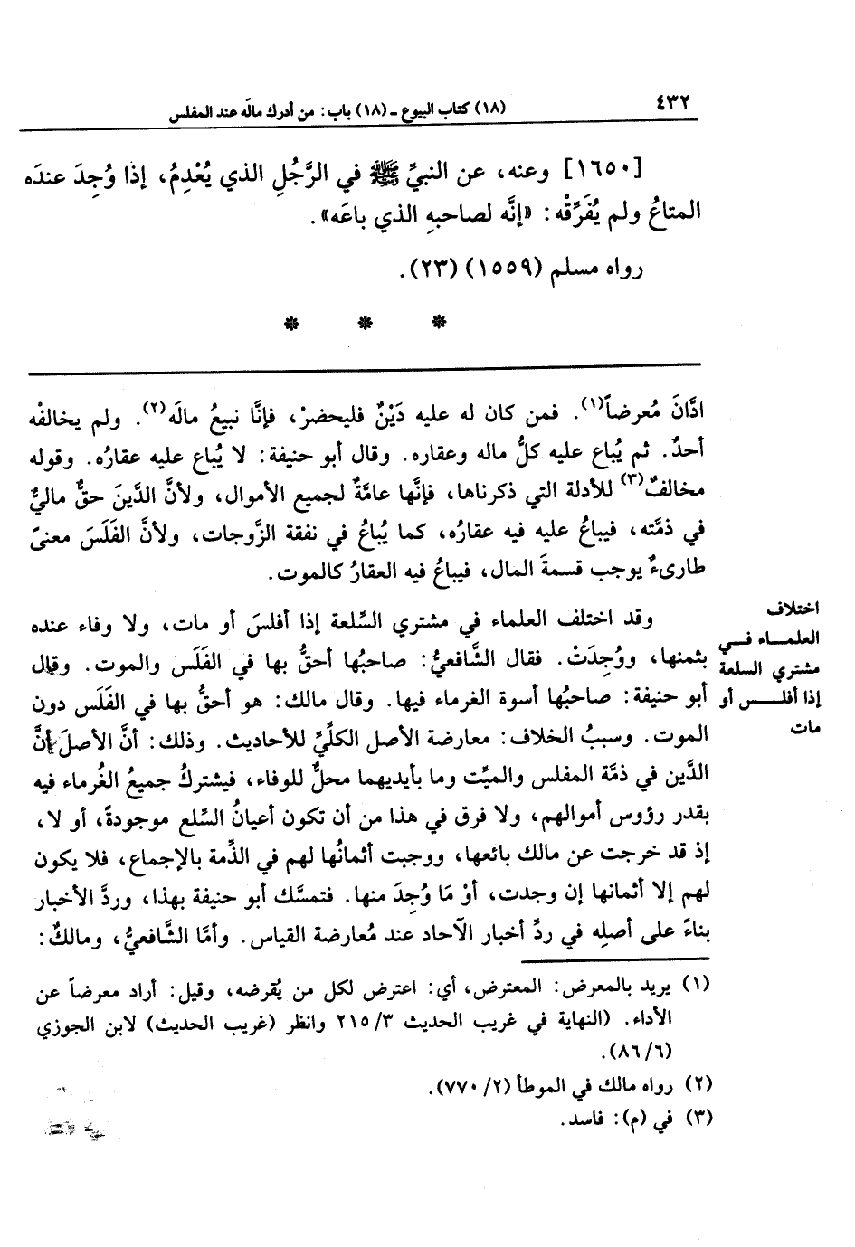وقد اختلف العلماء في مشتري السِّلعة إذا أفلس أو مات، ولا وفاء عنده بثمنها ووُجِدت. فقال الشافعي: صاحبها أحق بها في الفَلَس والموت. وقال أبو حنيفة: صاحبها أسوة الغرماء فيها. وقال مالك: هو أحق بها في الفَلَس دون الموت. وسبب الخلاف: معارضة الأصل الكلِّي للأحاديث. وذلك: أن الأصل أن الدَّين في ذمَّة المفلس والمَيِّت وما بأيديهما محل للوفاء، فيشترك جميع الغرماء فيه بقدر رؤوس أموالهم، ولا فرق في هذا من أن تكون أعيان السلع موجودة، أو لا؛ إذ قد خرجت عن مالك بائعها، ووجبت أثمانها لهم في الذمة بالإجماع، فلا يكون لهم إلا أثمانها إن وجدت، أو ما وُجِد منها. فتمسَّك أبو حنيفة بهذا، وردَّ الأخبار بناءً على أصله في ردِّ أخبار الآحاد عند معارضة القياس. وأما الشافعي ومالك:
