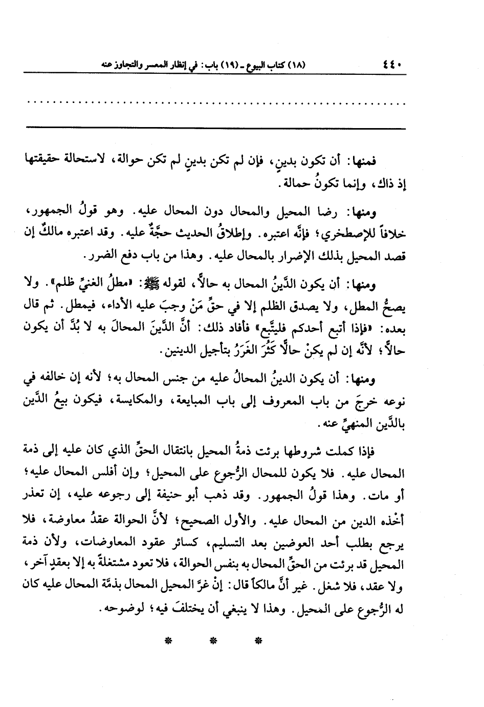 ومنها: رضا المحيل والمحال دون المحال عليه. وهو قول الجمهور، خلافًا للإصطخري، فإنَّه اعتبره. وإطلاق الحديث حجة عليه. وقد اعتبره مالك إن قصد المحيل بذلك الإضرار بالمحال عليه. وهذا من باب دفع الضرر.
