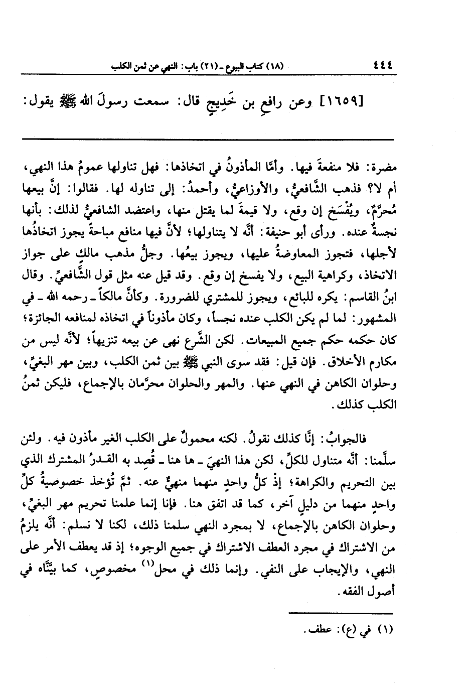 فالجواب: إنَّا كذلك نقول. لكنه محمولٌ على الكلب الغير مأذون فيه. ولئن سلمنا: أنَّه متناول للكل، لكن هذا النهي ها هنا قصد به القدر المشترك الذي بين التحريم والكراهة؛ إذ كل واحد منهما منهي عنه. ثم تؤخذ خصوصية كل واحد منهما من دليل آخر، كما قد اتفق هنا فإنا إنما علمنا تحريم مهر البغي، وحلوان الكاهن بالإجماع، لا بمجرد النهي سلمنا ذلك، لكنا لا نسلم: أنه يلزم من الاشتراك في مجرد العطف الاشتراك في جميع الوجوه؛ إذ قد يعطف الأمر على النهي، والإيجاب على النفي. وإنما ذلك في محل (¬1) مخصوص، كما بيناه في أصول الفقه.