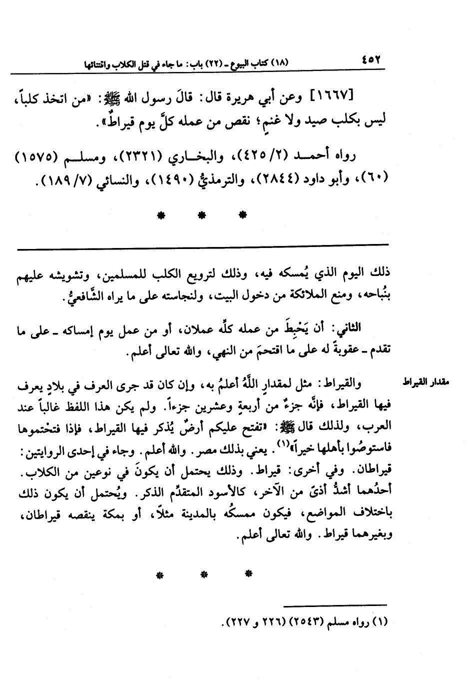 [1667] وعن أبي هُرَيرَةَ قَالَ: قَالَ رَسُولُ اللَّهِ صَلَّى اللهُ عَلَيهِ وَسَلَّمَ: مَن اتَّخَذَ كَلبًا لَيسَ بِكَلبِ صَيدٍ وَلَا غَنَمٍ، نَقَصَ مِن عَمَلِهِ كُلَّ يَومٍ قِيرَاطٌ.