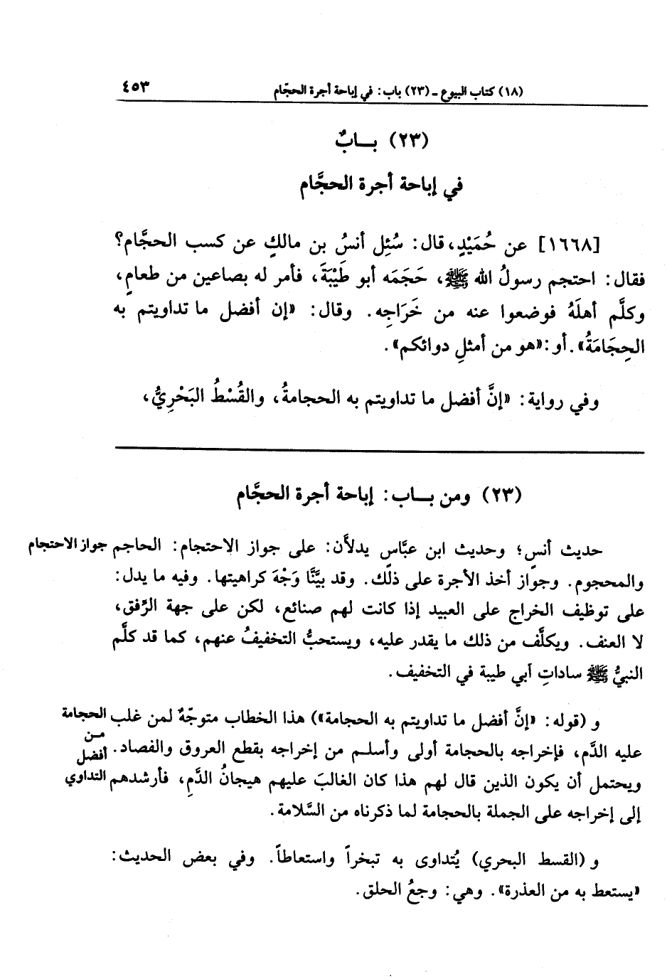 [1668] عَن حُمَيدٍ قَالَ: سُئِلَ أَنَسُ بنُ مَالِكٍ عَن كَسبِ الحَجَّامِ فَقَالَ: احتَجَمَ رَسُولُ اللَّهِ صَلَّى اللهُ عَلَيهِ وَسَلَّمَ، حَجَمَهُ أَبُو طَيبَةَ، فَأَمَرَ لَهُ بِصَاعَينِ مِن طَعَامٍ، وَكَلَّمَ أَهلَهُ فَوَضَعُوا عَنهُ مِن خَرَاجِهِ، وَقَالَ: إِنَّ أَفضَلَ مَا تَدَاوَيتُم بِهِ الحِجَامَةُ، أَو هُوَ مِن أَمثَلِ دَوَائِكُم.