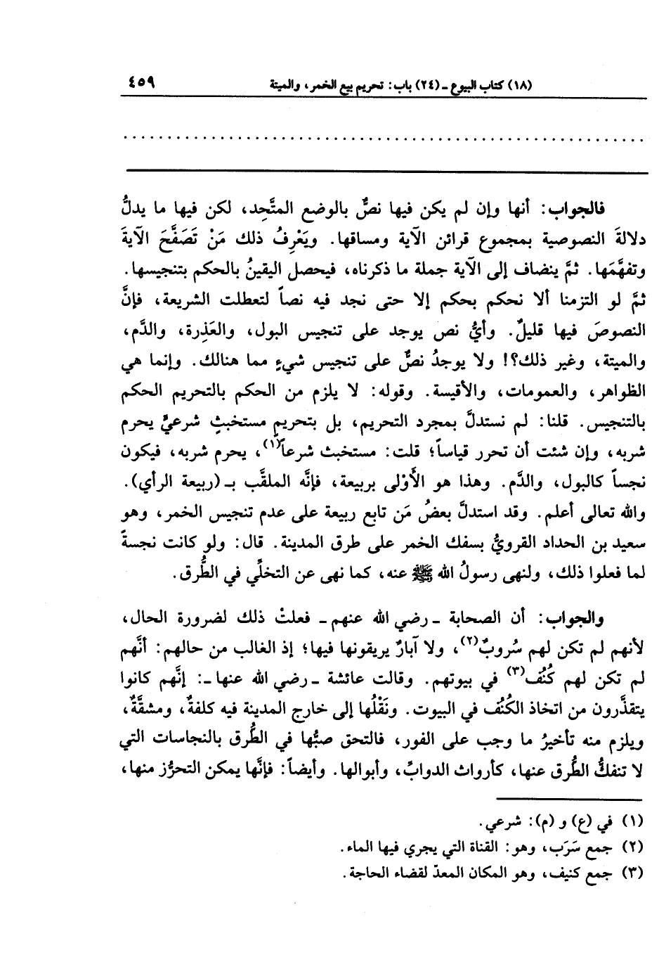 والجواب: أن الصحابة ـ رضي الله عنهم ـ فعلت ذلك لضرورة الحال، لأنهم لم تكن لهم سُروبٌ (¬2)، ولا آبارٌ يريقونها فيها؛ إذ الغالب من حالهم: أنهم لم تكن لهم كُنُف (¬3) في بيوتهم. وقالت عائشة رضي الله عنها: إنهم كانوا يتقذرون من اتخاذ الكنف في البيوت. ونَقلها إلى خارج المدينة فيه كلفة، ومشقة، ويلزم منه تأخير ما وجب على الفور، فالتحق صبها في الطرق بالنجاسات التي لا تنفكُّ الطرق عنها، كأرواث الدواب، وأبوالها. وأيضًا: فإنها يمكن التحرُّز منها،
