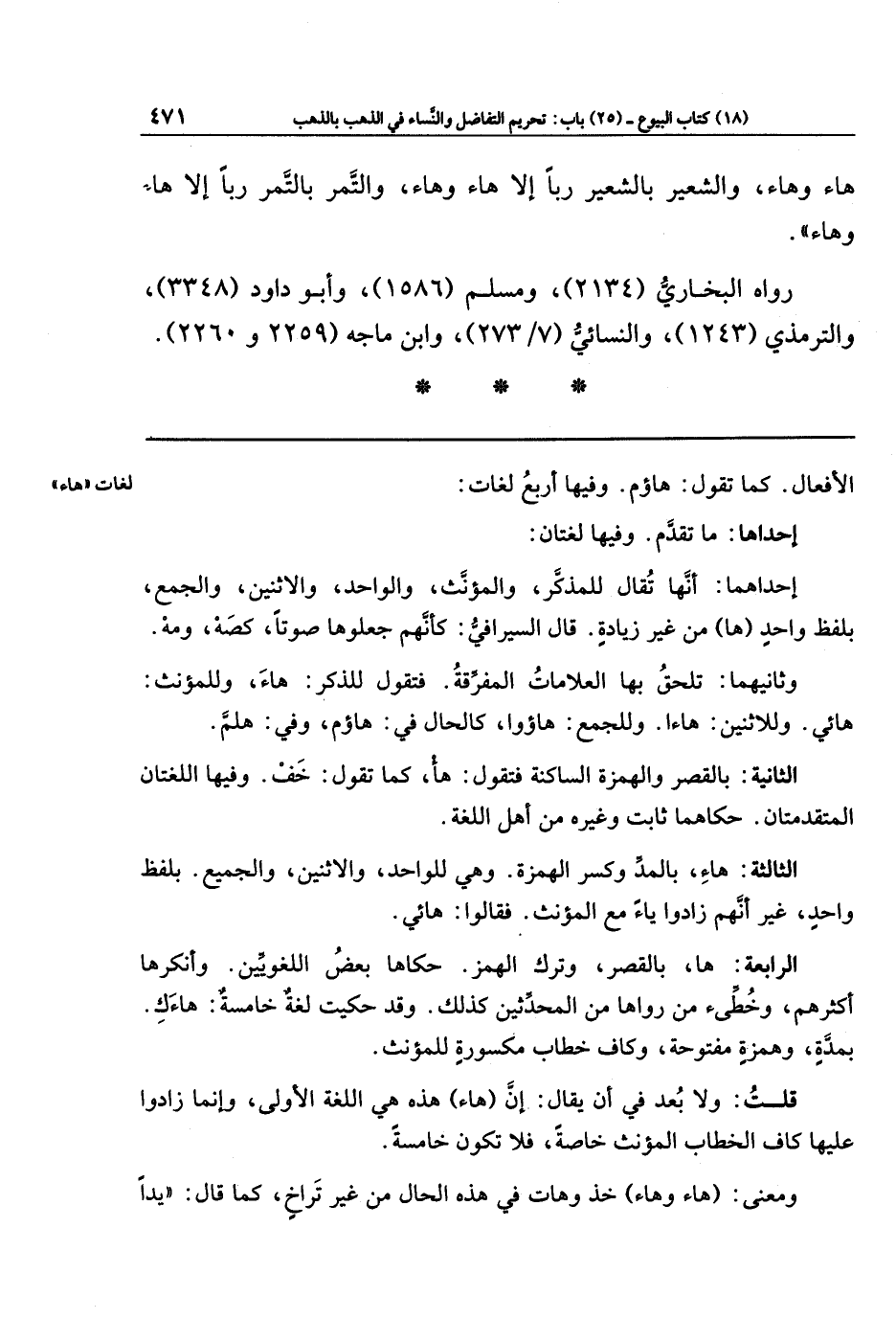 هَاءَ وَهَاءَ، وَالشَّعِيرُ بِالشَّعِيرِ رِبًا إِلَّا هَاءَ وَهَاءَ، وَالتَّمرُ بِالتَّمرِ رِبًا إِلَّا هَاءَ وَهَاءَ.