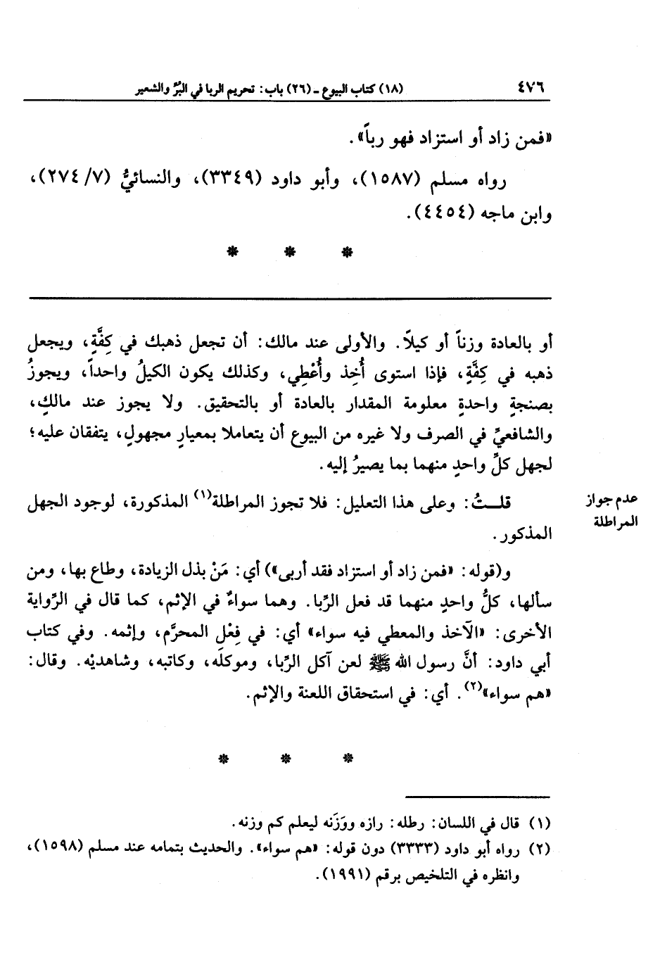 و(قوله: فمن زاد أو استزاد فقد أربى) أي: من بذل الزيادة، وطاع بها، ومن سألها، كل واحد منهما قد فعل الرِّبا. وهما سواء في الإثم؛ كما قال في الرواية الأخرى: (الآخذ والمعطي فيه سواء) أي: في فعل المُحَرَّم، وإثمه. وفي كتاب أبي داود: أن رسول الله صلى الله عليه وسلم لعن آكل الرِّبا، وموكله، وكاتبه، وشاهديه). وقال: (هم سواء) (¬2) أي: في استحقاق اللعنة والإثم.