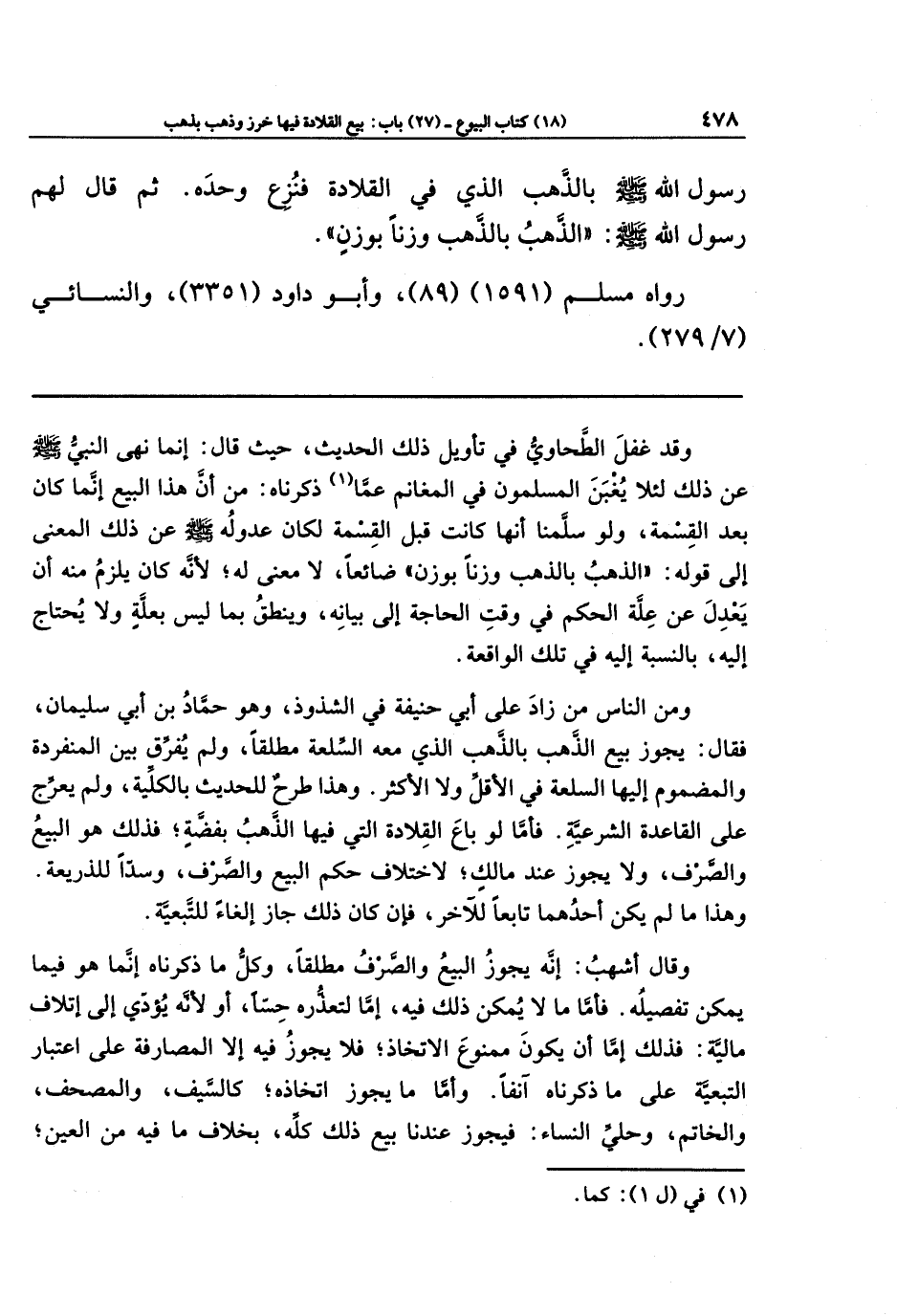 ومن الناس من زاد على أبي حنيفة في الشذوذ، وهو حمَّاد بن أبي سليمان، فقال: يجوز بيع الذهب بالذهب الذي معه السِّلعة مطلقا، ولم يُفرَّق بين المنفردة والمضموم إليها السلعة في الأقل ولا الأكثر. وهذا طرح للحديث بالكلية، ولم يعرِّج على القاعدة الشرعية. فأما لو باع القلادة التي فيها الذهب بفضة، فذلك هو البيع والصَّرف، ولا يجوز عند مالك؛ لاختلاف حكم البيع والصرف، وسدًّا للذريعة. وهذا ما لم يكن أحدهما تابعًا للآخر، فإن كان ذلك جاز إلغاء للتَّبعيَّة.