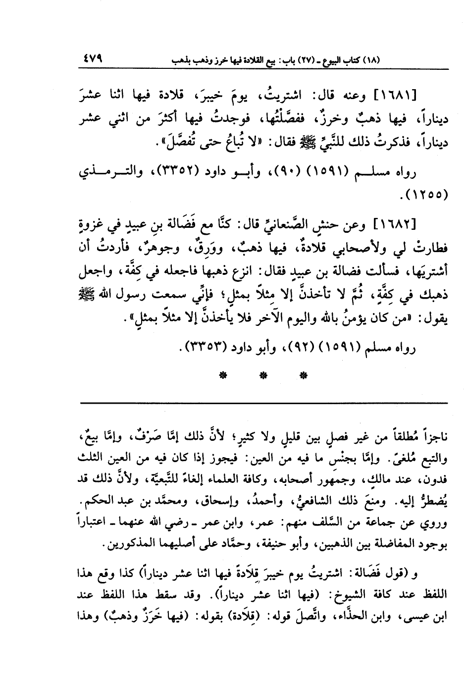 [1682] وعَن حَنَشٍ الصنعاني قَالَ: كُنَّا مَعَ فَضَالَةَ بنِ عُبَيدٍ فِي غَزوَةٍ، فَطَارَت لِي وَلِأَصحَابِي قِلَادَةٌ فِيهَا ذَهَبٌ وَوَرِقٌ وَجَوهَرٌ، فَأَرَدتُ أَن أَشتَرِيَهَا، فَسَأَلتُ فَضَالَةَ بنَ عُبَيدٍ فَقَالَ: انزِع ذَهَبَهَا فَاجعَلهُ فِي كِفَّةٍ، وَاجعَل ذَهَبَكَ فِي كِفَّةٍ، ثُمَّ لَا تَأخُذَنَّ إِلَّا مِثلًا بِمِثلٍ، فَإِنِّي سَمِعتُ رَسُولَ اللَّهِ صَلَّى اللَّهُ عَلَيهِ وَسَلَّمَ يَقُولُ: مَن كَانَ يُؤمِنُ بِاللَّهِ وَاليَومِ الآخِرِ فَلَا يَأخُذَنَّ إِلَّا مِثلًا بِمِثلٍ.