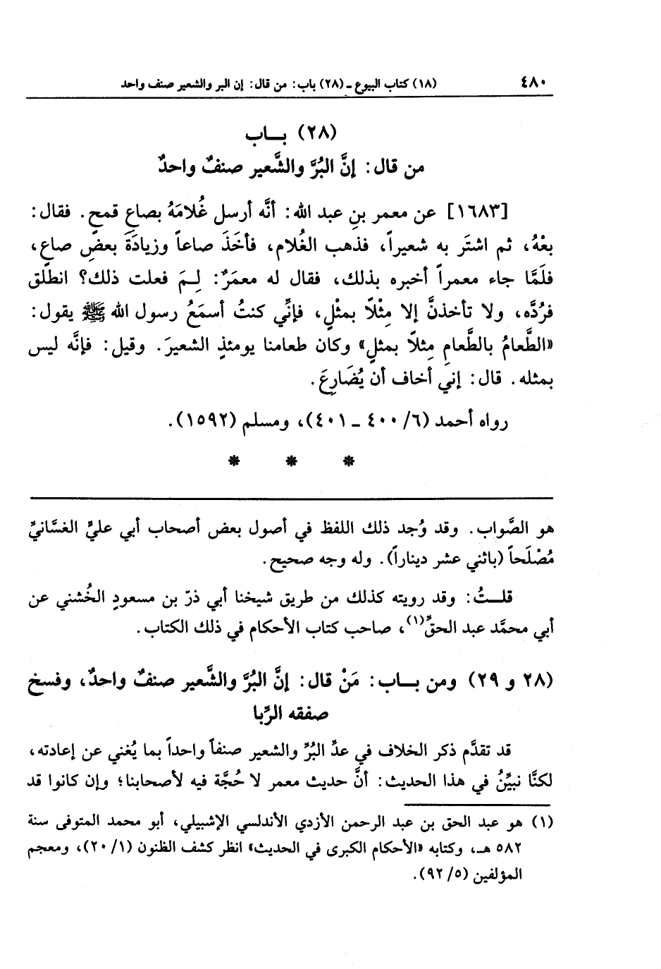 (¬1) هو عبد الحق بن عبد الرحمن الأزدي الأندلسي الإشبيلي، أبو محمد المتوفى سنة 582 هـ، وكتابه "الأحكام الكبرى في الحديث" انظر كشف الظنون (1/ 20)، ومعجم المؤلفين (5/ 92).