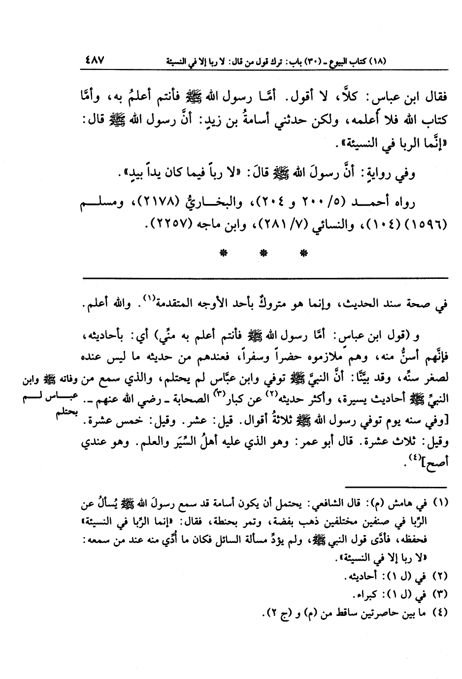 فَقَالَ ابنُ عَبَّاسٍ: كَلَّا لَا أَقُولُ، أَمَّا رَسُولُ اللَّهِ صَلَّى اللهُ عَلَيهِ وَسَلَّمَ، فَأَنتُم أَعلَمُ بِهِ، وَأَمَّا كِتَابُ اللَّهِ فَلَا أَعلَمُهُ، وَلَكِن حَدَّثَنِي أُسَامَةُ بنُ زَيدٍ: أَنَّ رَسُولَ اللَّهِ صَلَّى اللَّهُ عَلَيهِ وَسَلَّمَ قَالَ: إِنَّمَا الرِّبَا فِي النَّسِيئَةِ.
