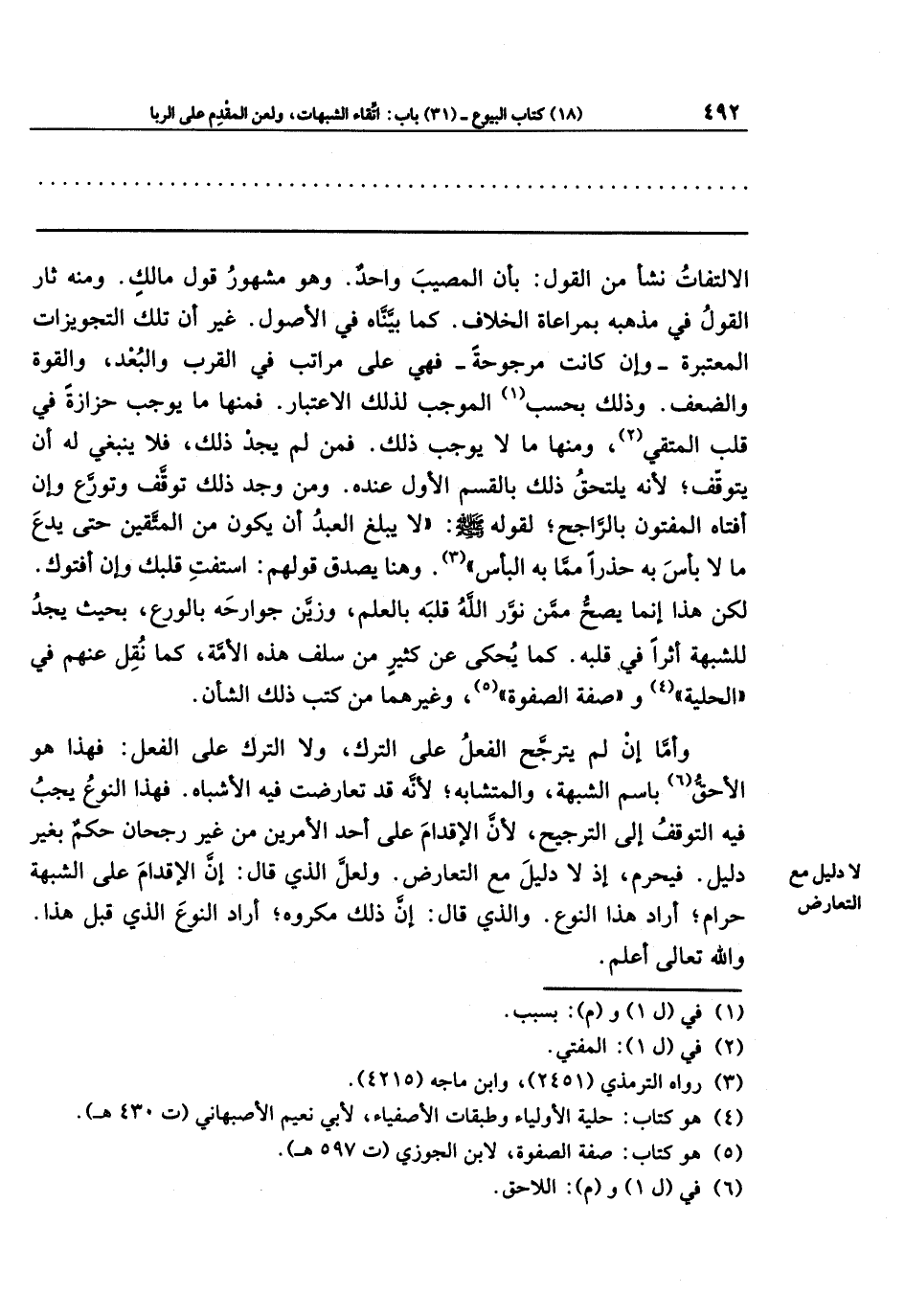 وأما إن لم يترجح الفعل على الترك، ولا الترك على الفعل: فهذا هو الأحق (¬6) باسم الشبهة، والمتشابه؛ لأنه فد تعارضت فيه الأشباه. فهذا النوع يجب فيه التوقف إلى الترجيح، لأن الإقدام على أحد الأمرين من غير رجحان حكم بغير دليل. فيحرم، إذ لا دليل مع التعارض. ولعل الذي قال: إن الإقدام على الشبهة حرام؛ أراد هذا النوع. والذي قال: إن ذلك مكروه؛ أراد النوع الذي قبل هذا، والله تعالى أعلم.