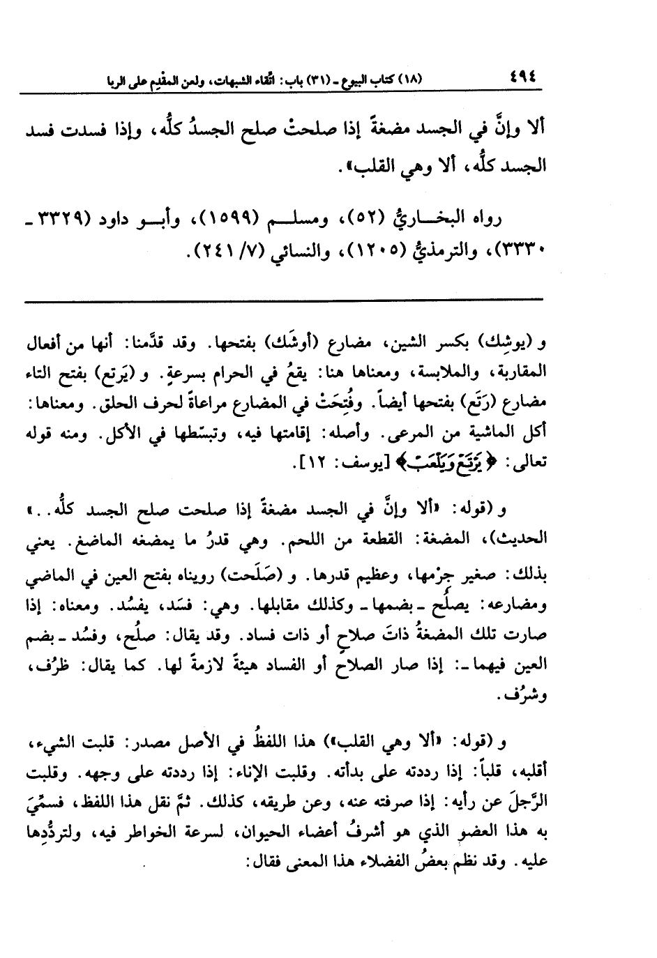 و(قوله: ألا وإن في الجسد مضغة إذا صلحت صلح الجسد كله) الحديث، المضغة: القطعة من اللحم. وهي قدر ما يمضغه الماضغ؛ يعني بذلك: صغير جرمها، وعظيم قدرها. و (صلحت) رويناه بفتح العين في الماضي ومضارعه: يصلح بضمها، وكذلك مقابلها. وهي: فسد، يفسد. ومعناه: إذا صارت تلك المضغة ذات صلاح أو ذات فساد. وقد يقال: صلح، وفسد - بضم العين فيهما-: إذا صار الصلاح أو الفساد هيئة لازمة لها. كما يقال: ظَرُف، وشَرُف.