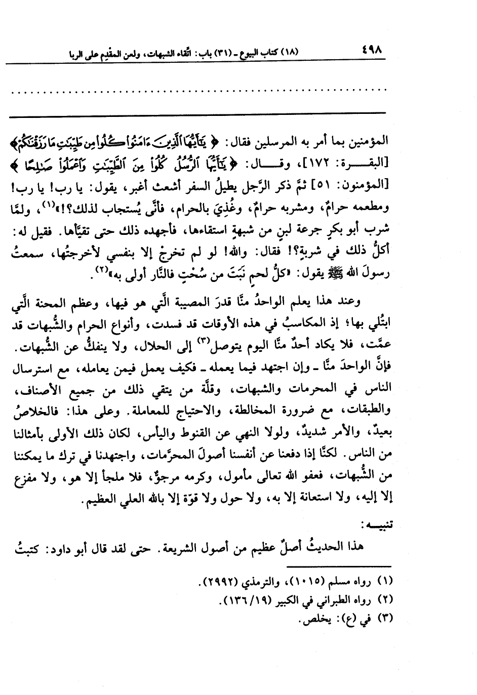 وعند هذا يعلم الواحد منا قدر المصيبة التي هو فيها، وعظم المحنة التي ابتلي بها؛ إذ المكاسب في هذه الأوقات قد فسدت، وأنواع الحرام والشبهات قد عمَّت، فلا يكاد أحدٌ منَّا اليوم يتوصل (¬3) إلى الحلال، ولا ينفك عن الشبهات. فإن الواحد منَّا - وإن اجتهد فيما يعمله - فكيف يعمل فيمن يعامله، مع استرسال الناس في المحرمات والشبهات، وقلة من يتقي ذلك من جميع الأصناف، والطبقات، مع ضرورة المخالطة، والاحتياج للمعاملة. وعلى هذا: فالخلاص بعيد، والأمر شديد، ولولا النهي عن القنوط واليأس، لكان ذلك الأولى بأمثالنا من الناس. لكنَّا إذا دفعنا عن أنفسنا أصول المحرمات، واجتهدنا في ترك ما يمكننا من الشبهات، فعفو الله تعالى مأمول، وكرمه مرجوّ، فلا ملجأ إلا هو، ولا مفزع إلا إليه، ولا استعانة إلا به، ولا حول ولا قوَّة إلا بالله العلي العظيم.