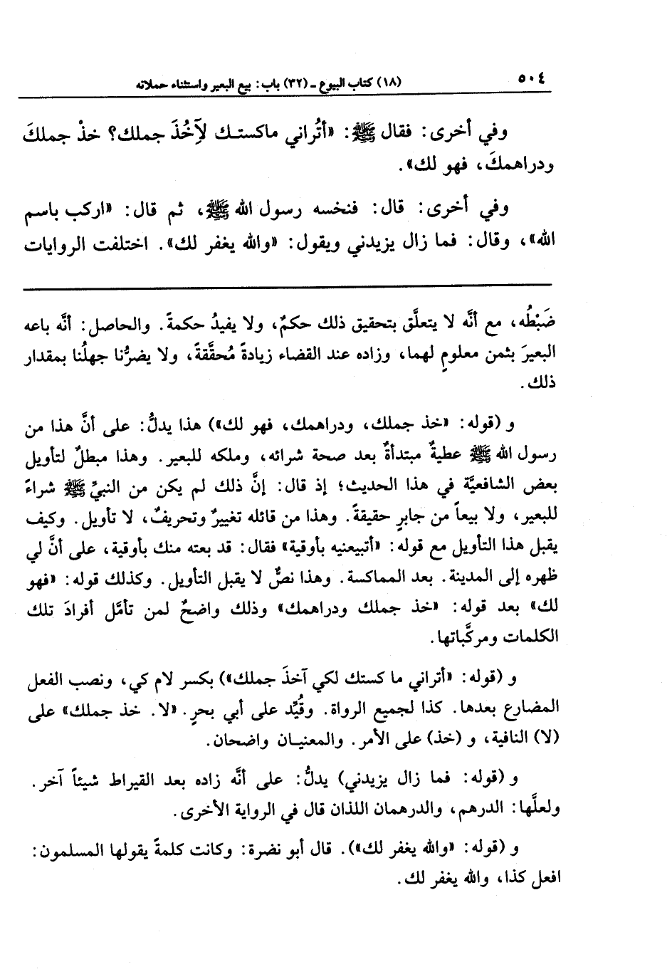 وفي أخرى: فَقَالَ صَلَّى اللهُ عَلَيهِ وَسَلَّمَ: أَتُرَانِي مَاكَستُكَ لِآخُذَ جَمَلَكَ؟ خُذ جَمَلَكَ وَدَرَاهِمَكَ فَهُوَ لَكَ.