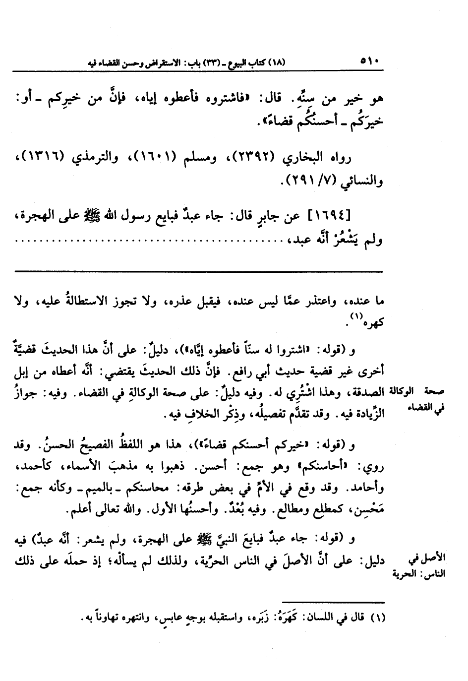 و(قوله: خيركم أحسنكم قضاء) هذا هو اللفظ الفصيح الحسن. وقد روي: (أحاسنكم) وهو جمع: أحسن. ذهبوا به مذهب الأسماء، كأحمد، وأحامد. وقد وقع في الأم في بعض طرقه: (محاسنكم) بالميم، وكأنَّه جمع: مَحسِن، كمطلِع ومطالع. وفيه بُعد. وأحسنُها الأول، والله تعالى أعلم.