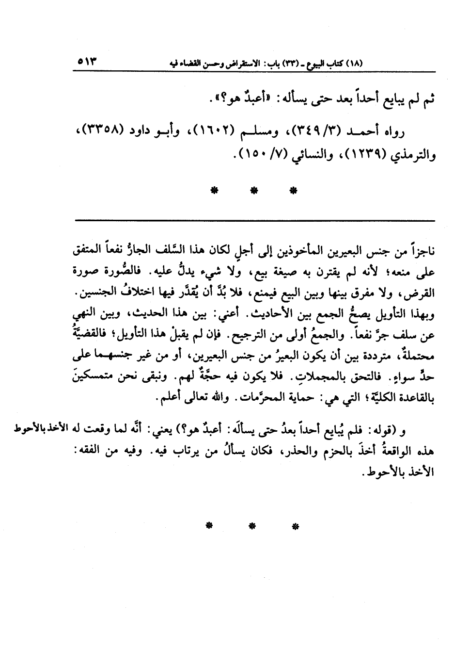 وبهذا التأويل يصح الجمع بين الأحاديث؛ أعني: بين هذا الحديث، وبين النهي عن سلف جرّ نفعًا. والجمع أولى من الترجيح. فإن لم يقبل هذا التأويل؛ فالقضية محتملة، مترددة بين أن يكون البعير من جنس البعيرين، أو من غير جنسهما على حدٍّ سواء. فالتحق بالمجملات، فلا يكون فيه حجة لهم. ونبقى نحن متمسكين بالقاعدة الكلية؛ التي هي: حماية المحرَّمات، والله تعالى أعلم.