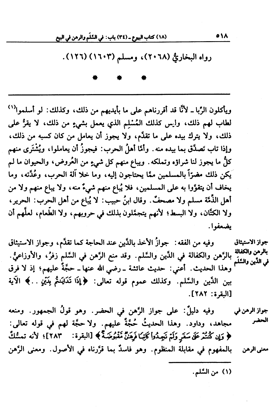 وفيه من الفقه: جواز الأخذ بالدَّين عند الحاجة كما تقدَّم، وجواز الاستيثاق بالرهن والكفالة في الدَّين والسَّلم. وقد منع الرَّهن في السَّلم زفر، والأوزاعي. وهذا الحديث؛ أعني: حديث عائشة رضي الله عنها حجة عليهم؛ إذ لا فرق بين الدَّين والسَّلم. وكذلك عموم قوله تعالى: {إِذَا تَدَايَنتُم بِدَينٍ} الآية.