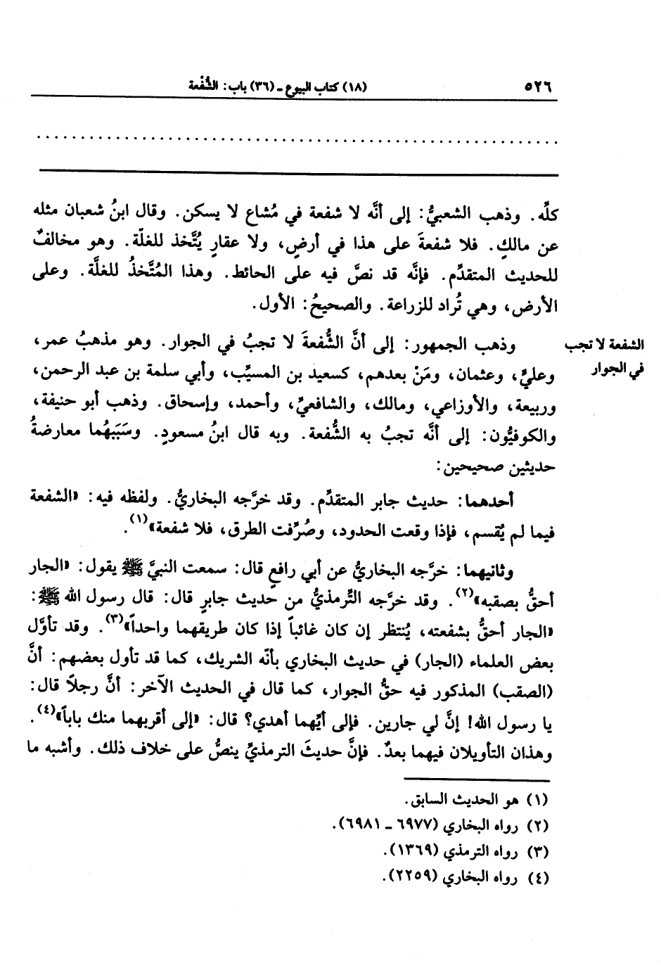 وذهب الجمهور: إلى أن الشفعة لا تجب في الجوار؛ وهو مذهب عمر، وعلي، وعثمان، ومن بعدهم، كسعيد بن المسيب، وأبي سلمة بن عبد الرحمن، وربيعة، والأوزاعي، ومالك، والشافعي، وأحمد، وإسحاق. وذهب أبو حنيفة والكوفيون: إلى أنه تجب به الشفعة، وبه قال ابن مسعود. وسببهما معارضة حديثين صحيحين: