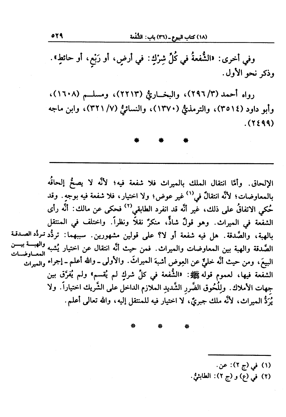 وفي أخرى: الشُّفعَةُ فِي كُلِّ شِركٍ فِي أَرضٍ، أَو رَبعٍ، أَو حَائِطٍ. وذكر نحو الأول.