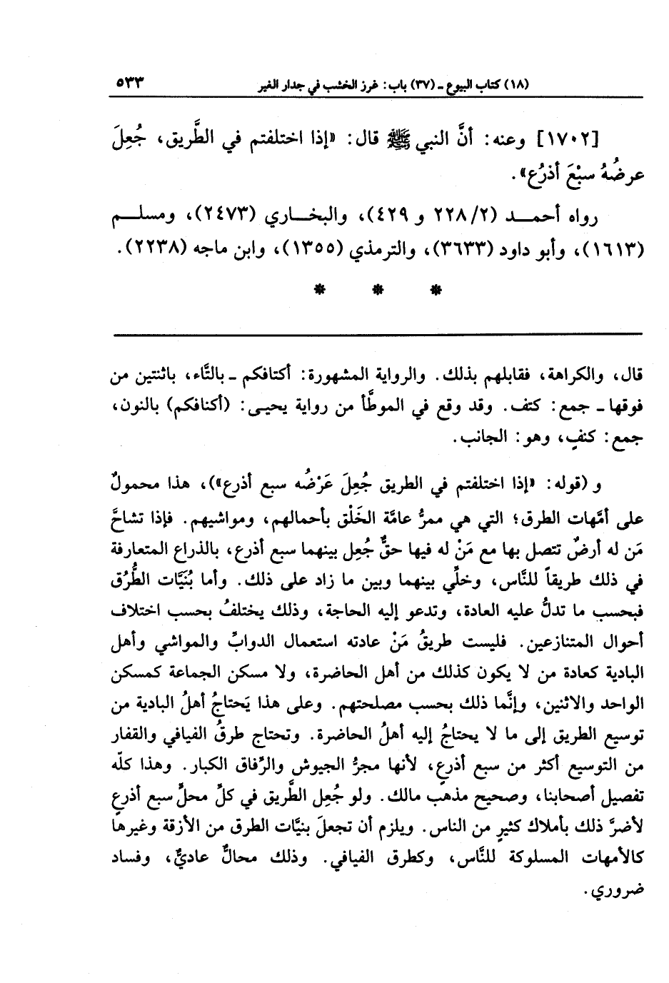 [1702] وعنه: أَنَّ النَّبِيَّ صَلَّى اللَّهُ عَلَيهِ وَسَلَّمَ قَالَ: إِذَا اختَلَفتُم فِي الطَّرِيقِ، جُعِلَ عَرضُهُ سَبعَ أَذرُعٍ.