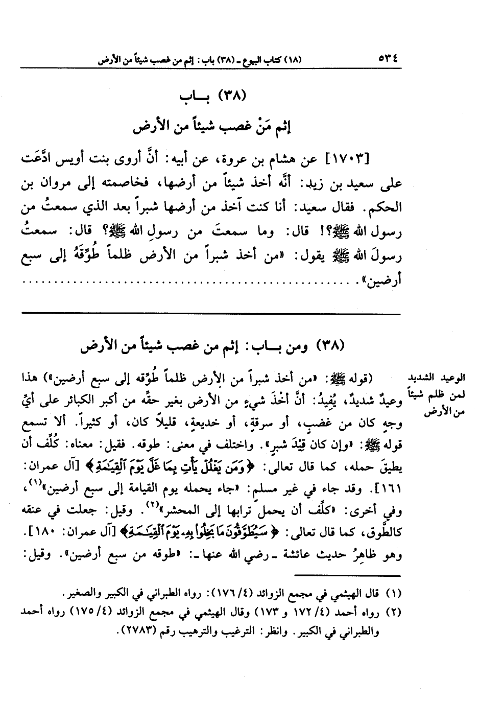 [1703] عَن هِشَامِ بنِ عُروَةَ، عَن أَبِيهِ: أَنَّ أَروَى بِنتَ أُوَيسٍ، ادَّعَت عَلَى سَعِيدِ بنِ زَيدٍ أَنَّهُ أَخَذَ شَيئًا مِن أَرضِهَا، فَخَاصَمَتهُ إِلَى مَروَانَ بنِ الحَكَمِ، فَقَالَ سَعِيدٌ: أَنَا كُنتُ آخُذُ مِن أَرضِهَا شِبرًا بَعدَ الَّذِي سَمِعتُ مِن رَسُولِ اللَّهِ صَلَّى اللهُ عَلَيهِ وَسَلَّمَ، قَالَ: وَمَا سَمِعتَ مِن رَسُولِ اللَّهِ صَلَّى اللهُ عَلَيهِ وَسَلَّمَ؟ قَالَ: سَمِعتُ رَسُولَ اللَّهِ صَلَّى اللَّهُ عَلَيهِ وَسَلَّمَ يَقُولُ: مَن أَخَذَ شِبرًا مِن الأَرضِ ظُلمًا، طُوِّقَهُ إِلَى سَبعِ أَرَضِينَ،
