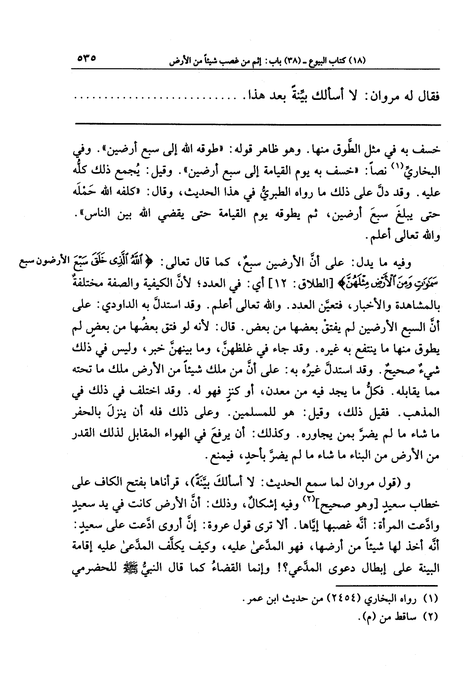 وفيه ما يدل: على أن الأرضين سبع، كما قال تعالى: {اللَّهُ الَّذِي خَلَقَ سَبعَ سَمَاوَاتٍ وَمِنَ الأَرضِ مِثلَهُنَّ}؛ أي: في العدد؛ لأن الكيفية والصفة مختلفة بالمشاهدة والأخبار، فتعيَّن العدد، والله تعالى أعلم. وقد استدل به الداودي: على أن السبع الأرضين لم يفتق بعضها من بعض. قال: لأنه لو فتق بعضها من بعض لم يطوق منها ما ينتفع به غيره. وقد جاء في غلظهن، وما بينهن خبر، وليس في ذلك شيء صحيح. وقد استدل غيره به: على أن من ملك شيئًا من الأرض ملك ما تحته مما يقابله. فكل ما يجد فيه من معدن، أو كنز فهو له. وقد اختلف في ذلك في المذهب. فقيل ذلك، وقيل: هو للمسلمين. وعلى ذلك فله أن ينزل بالحفر ما شاء ما لم يضر بمن يجاوره. وكذلك: أن يرفع في الهواء المقابل لذلك القدر من الأرض من البناء ما شاء ما لم يضر بأحد، فيُمنَع.