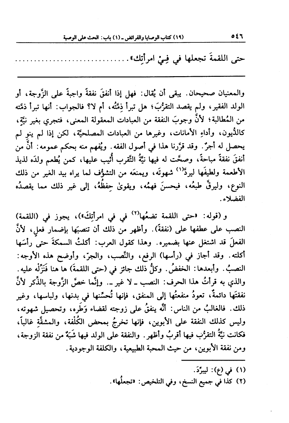 والمعنيان صحيحان. يبقى أن يقال: فهل إذا أنفق نفقةً واجبةً على الزوجة، أو الولد الفقير، ولم يقصد التقرب؛ هل تبرأ ذمته، أم لا؟ فالجواب: أنها تبرأ ذمته من المطالبة؛ لأن وجوب النفقة من العبادات المعقولة المعنى، فتجري بغير نيَّة، كالدِّيون، وأداء الأمانات، وغيرها من العبادات المصلحية، لكن إذا لم ينو لم يحصل له أجر. وقد قرَّرنا هذا في أصول الفقه. ويفهم منه بحكم عمومه: أن من أنفق نفقة مباحة، وصحَّت له فيها نيَّةُ التَّقرب أثيب عليها، كمن يطعم ولده لذيذ الأطعمة ولطيفها ليردَّ (¬1) شهوته، ويمنعه من التشوُّف لما يراه بيد الغير من ذلك النوع، وليرق طبعه، فيحسن فهمه، ويقوى حفظه، إلى غير ذلك مما يقصده الفضلاء.